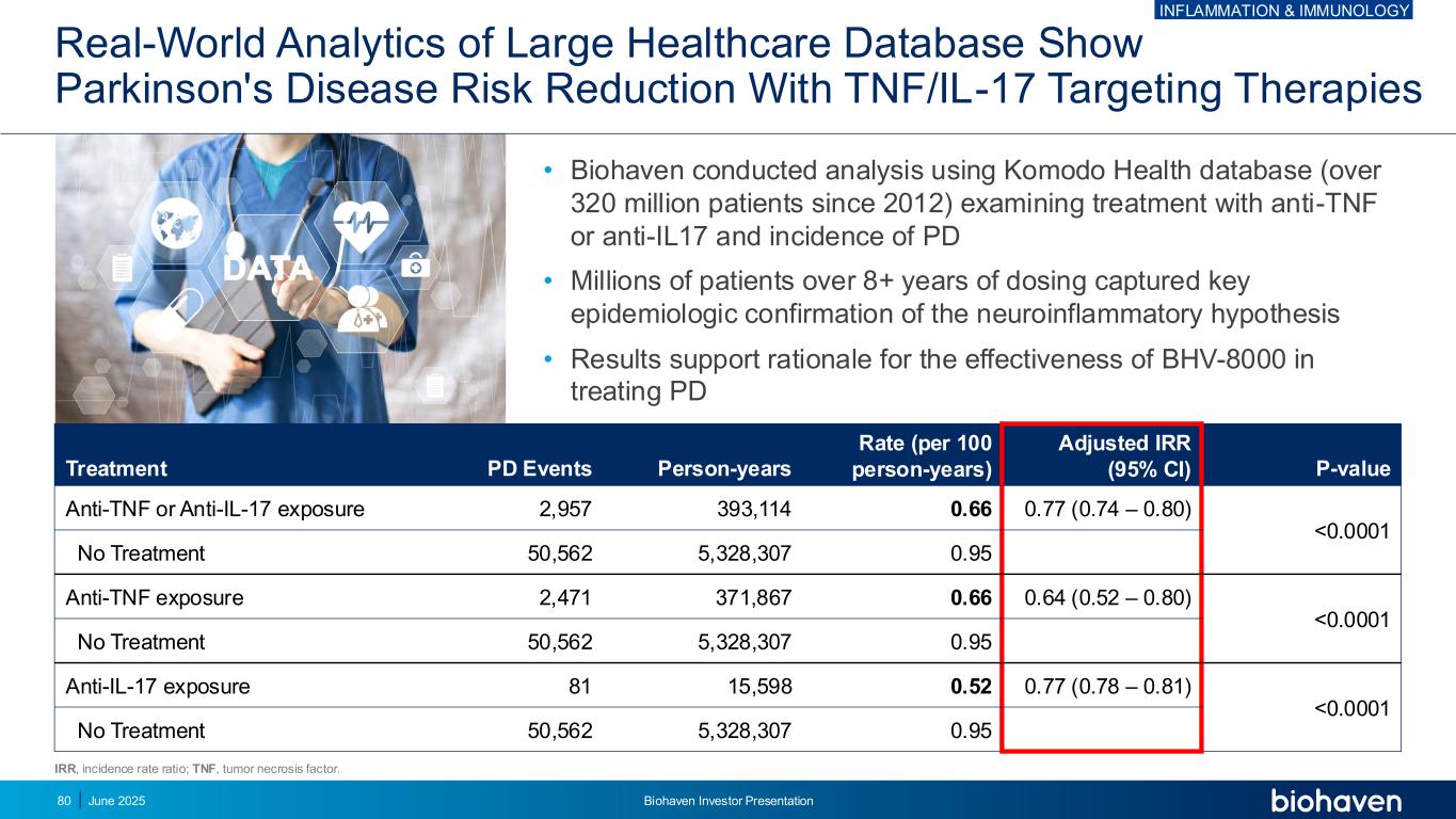 Real-World Analytics of Large Healthcare Database Show Parkinson's Disease Risk Reduction With TNF/IL-17 Targeting Therapies • Biohaven conducted analysis using Komodo Health database (over  320 million patients since 2012) examining treatment with anti-TNF  or anti-IL17 and incidence of PD • Millions of patients over 8+ years of dosing captured key  epidemiologic confirmation of the neuroinflammatory hypothesis • Results support rationale for the effectiveness of BHV-8000 in  treating PD Treatment PD Events Person-years Rate (per 100  person-years) Adjusted IRR  (95% CI) P-value Anti-TNF or Anti-IL-17 exposure 2,957 393,114 0.66 0.77 (0.74 – 0.80) <0.0001 No Treatment 50,562 5,328,307 0.95 Anti-TNF exposure 2,471 371,867 0.66 0.64 (0.52 – 0.80) <0.0001  No Treatment 50,562 5,328,307 0.95 Anti-IL-17 exposure 81 15,598 0.52 0.77 (0.78 – 0.81) <0.0001  No Treatment 50,562 5,328,307 0.95 IRR, incidence rate ratio; TNF, tumor necrosis factor. INFLAMMATION & IMMUNOLOGY June 2025 Biohaven Investor Presentation80