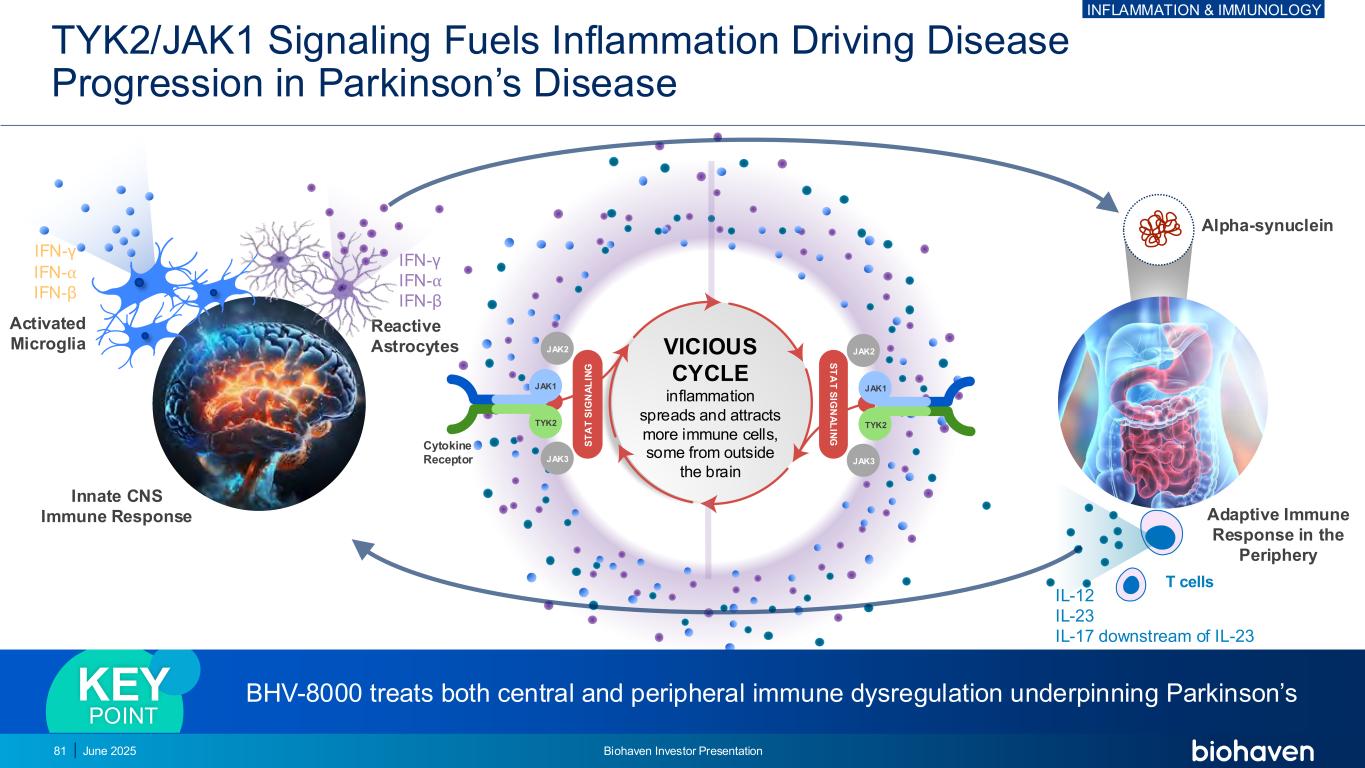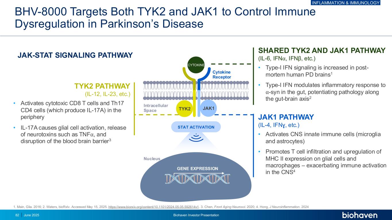 BHV-8000 Targets Both TYK2 and JAK1 to Control Immune  Dysregulation in Parkinson’s Disease 82 1. Main, Glia. 2016; 2. Waters, bioRxIv. Accessed May 15, 2025. https://www.biorxiv.org/content/10.1101/2024.05.05.592614v1. 3. Chen, Front Aging Neurosci. 2020; 4. Hong, J Neuroinflammation. 2024 STAT ACTIVATION GENE EXPRESSION Cytokine  Receptor JAK1TYK2 CYTOKINE JAK-STAT SIGNALING PATHWAY  SHARED TYK2 AND JAK1 PATHWAY (IL-6, IFN⍺, IFNβ, etc.)  • Type-I IFN signaling is increased in post- mortem human PD brains1 • Type-I IFN modulates inflammatory response to  ⍺-syn in the gut, potentiating pathology along  the gut-brain axis2   JAK1 PATHWAY (IL-4, IFNɣ, etc.)  • Activates CNS innate immune cells (microglia  and astrocytes) • Promotes T cell infiltration and upregulation of  MHC II expression on glial cells and  macrophages – exacerbating immune activation  in the CNS4 TYK2 PATHWAY (IL-12, IL-23, etc.)  • Activates cytotoxic CD8 T cells and Th17  CD4 cells (which produce IL-17A) in the  periphery • IL-17A causes glial cell activation, release  of neurotoxins such as TNF⍺, and  disruption of the blood brain barrier3 Intracellular  Space Nucleus June 2025 Biohaven Investor Presentation INFLAMMATION & IMMUNOLOGY
