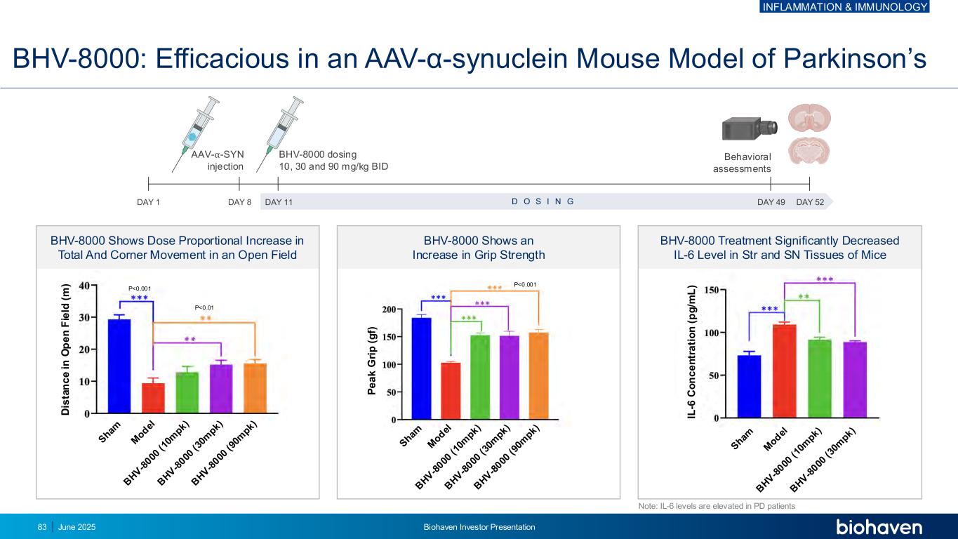 BHV-8000: Efficacious in an AAV-α-synuclein Mouse Model of Parkinson’s BHV-8000 Shows Dose Proportional Increase in  Total And Corner Movement in an Open Field  BHV-8000 Shows an  Increase in Grip Strength  P<0.001 P<0.01 P<0.001 BHV-8000 Treatment Significantly Decreased  IL-6 Level in Str and SN Tissues of Mice Note: IL-6 levels are elevated in PD patients D is ta n c e  i n  O p e n  F ie ld  ( m ) P e a k  G ri p  ( g f) IL -6  C o n c e n tr a ti o n  ( p g /m L ) AAV-⍺-SYN  injection BHV-8000 dosing 10, 30 and 90 mg/kg BID DAY 1 DAY 8 DAY 11 DAY 49 DAY 52D O S I N G Behavioral  assessments INFLAMMATION & IMMUNOLOGY June 2025 Biohaven Investor Presentation83