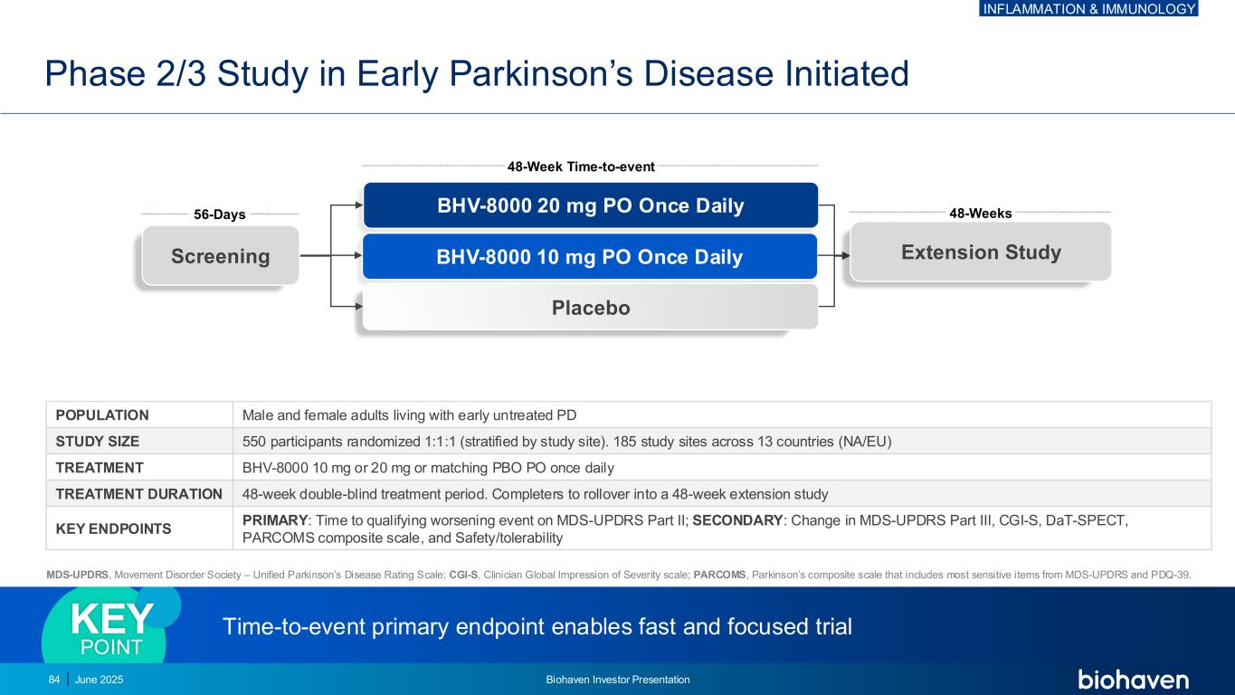MDS-UPDRS, Movement Disorder Society – Unified Parkinson’s Disease Rating Scale; CGI-S, Clinician Global Impression of Severity scale; PARCOMS, Parkinson’s composite scale that includes most sensitive items from MDS-UPDRS and PDQ-39. 48-Week Time-to-event BHV-8000 20 mg PO Once Daily BHV-8000 10 mg PO Once Daily Placebo 56-Days 48-Weeks Screening POPULATION Male and female adults living with early untreated PD STUDY SIZE 550 participants randomized 1:1:1 (stratified by study site). 185 study sites across 13 countries (NA/EU) TREATMENT BHV-8000 10 mg or 20 mg or matching PBO PO once daily TREATMENT DURATION 48-week double-blind treatment period. Completers to rollover into a 48-week extension study KEY ENDPOINTS PRIMARY: Time to qualifying worsening event on MDS-UPDRS Part II; SECONDARY: Change in MDS-UPDRS Part III, CGI-S, DaT-SPECT,  PARCOMS composite scale, and Safety/tolerability Extension Study Phase 2/3 Study in Early Parkinson’s Disease Initiated Time-to-event primary endpoint enables fast and focused trial KEY  POINT 84 June 2025 Biohaven Investor Presentation INFLAMMATION & IMMUNOLOGY
