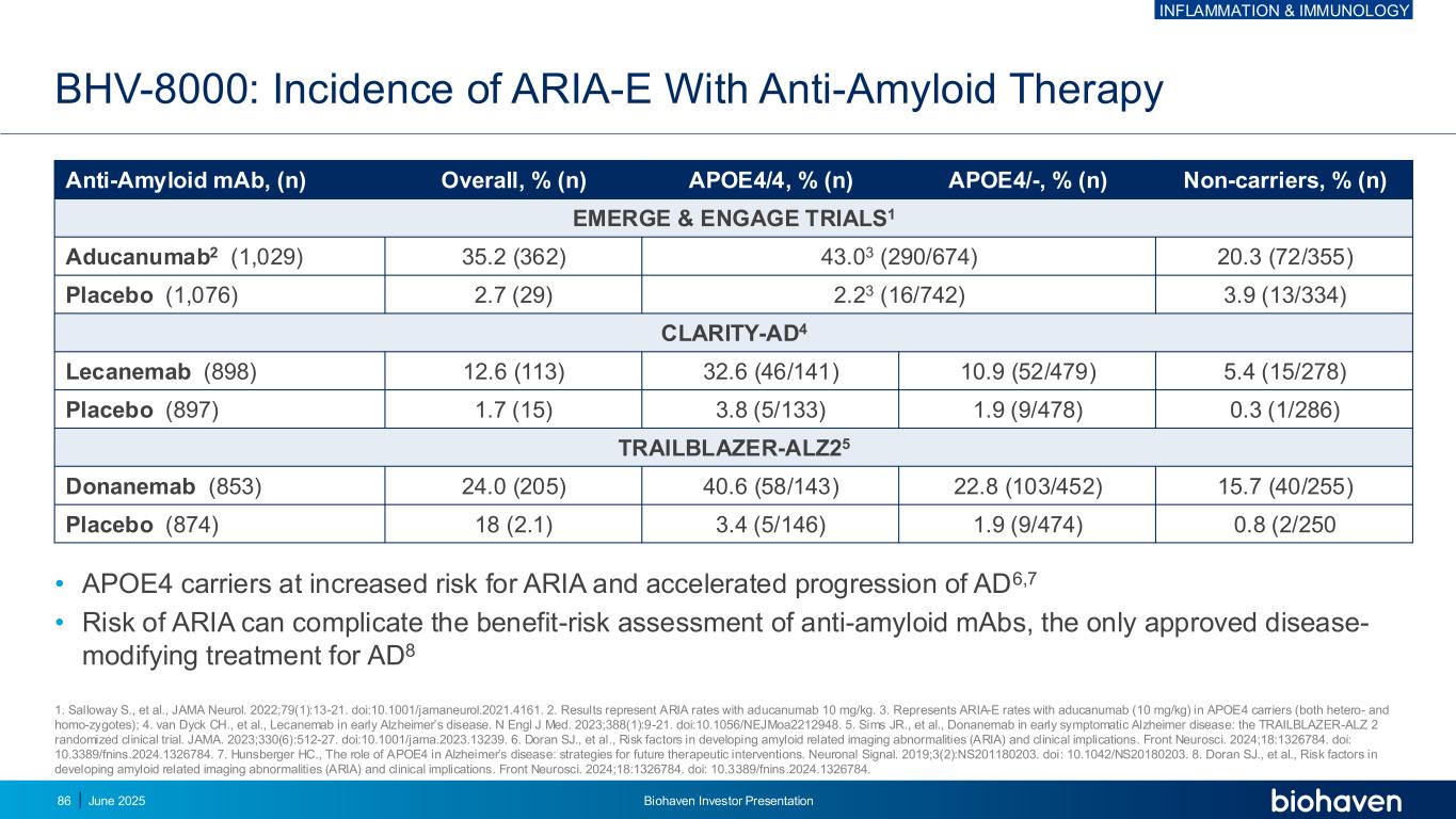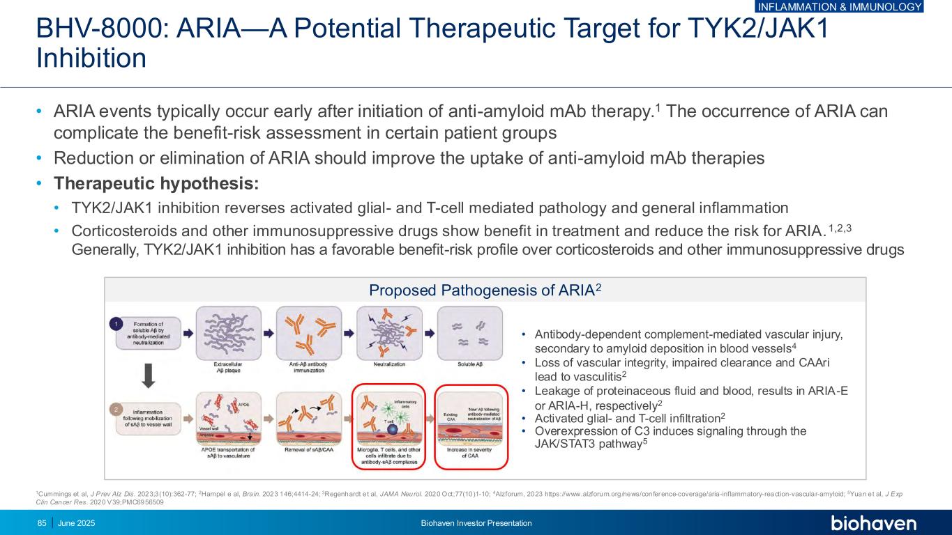 BHV-8000: ARIA—A Potential Therapeutic Target for TYK2/JAK1  Inhibition • ARIA events typically occur early after initiation of anti-amyloid mAb therapy.1 The occurrence of ARIA can  complicate the benefit-risk assessment in certain patient groups • Reduction or elimination of ARIA should improve the uptake of anti-amyloid mAb therapies • Therapeutic hypothesis: • TYK2/JAK1 inhibition reverses activated glial- and T-cell mediated pathology and general inflammation  • Corticosteroids and other immunosuppressive drugs show benefit in treatment and reduce the risk for ARIA.1,2,3  Generally, TYK2/JAK1 inhibition has a favorable benefit-risk profile over corticosteroids and other immunosuppressive drugs 1Cummings et al, J Prev Alz Dis. 2023;3(10):362-77; 2Hampel e al, Brain. 2023 146;4414-24; 3Regenhardt et al, JAMA Neurol. 2020 Oct;77(10)1-10; 4Alzforum, 2023 https://www.alzforum.org/news/conference-coverage/aria-inflammatory-reaction-vascular-amyloid; 5Yuan et al, J Exp  Clin Cancer  Res. 2020 V39;PMC6956509  Proposed Pathogenesis of ARIA2 • Antibody-dependent complement-mediated vascular injury,  secondary to amyloid deposition in blood vessels4 • Loss of vascular integrity, impaired clearance and CAAri  lead to vasculitis2 • Leakage of proteinaceous fluid and blood, results in ARIA-E  or ARIA-H, respectively2 • Activated glial- and T-cell infiltration2 • Overexpression of C3 induces signaling through the  JAK/STAT3 pathway5 INFLAMMATION & IMMUNOLOGY June 2025 Biohaven Investor Presentation85