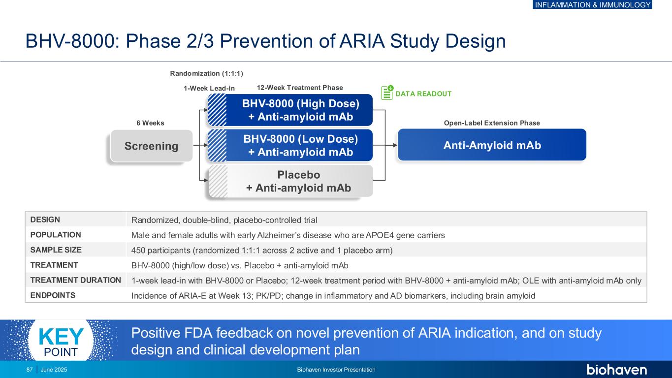 • APOE4 carriers at increased risk for ARIA and accelerated progression of AD6,7 • Risk of ARIA can complicate the benefit-risk assessment of anti-amyloid mAbs, the only approved disease- modifying treatment for AD8 BHV-8000: Incidence of ARIA-E With Anti-Amyloid Therapy Anti-Amyloid mAb, (n) Overall, % (n) APOE4/4, % (n) APOE4/-, % (n) Non-carriers, % (n) EMERGE & ENGAGE TRIALS1 Aducanumab2  (1,029) 35.2 (362) 43.03 (290/674) 20.3 (72/355) Placebo  (1,076) 2.7 (29) 2.23 (16/742) 3.9 (13/334) CLARITY-AD4 Lecanemab  (898) 12.6 (113) 32.6 (46/141) 10.9 (52/479) 5.4 (15/278) Placebo  (897) 1.7 (15) 3.8 (5/133) 1.9 (9/478) 0.3 (1/286) TRAILBLAZER-ALZ25 Donanemab  (853) 24.0 (205) 40.6 (58/143) 22.8 (103/452) 15.7 (40/255) Placebo  (874) 18 (2.1) 3.4 (5/146) 1.9 (9/474) 0.8 (2/250 1. Salloway S., et al., JAMA Neurol. 2022;79(1):13-21. doi:10.1001/jamaneurol.2021.4161. 2. Results represent ARIA rates with aducanumab 10 mg/kg. 3. Represents ARIA-E rates with aducanumab (10 mg/kg) in APOE4 carriers (both hetero- and  homo-zygotes); 4. van Dyck CH., et al., Lecanemab in early Alzheimer’s disease. N Engl J Med. 2023;388(1):9-21. doi:10.1056/NEJMoa2212948. 5. Sims JR., et al., Donanemab in early symptomatic Alzheimer disease: the TRAILBLAZER-ALZ 2  randomized clinical trial. JAMA. 2023;330(6):512-27. doi:10.1001/jama.2023.13239. 6. Doran SJ., et al., Risk factors in developing amyloid related imaging abnormalities (ARIA) and clinical implications. Front Neurosci. 2024;18:1326784. doi:  10.3389/fnins.2024.1326784. 7. Hunsberger HC., The role of APOE4 in Alzheimer’s disease: strategies for future therapeutic interventions. Neuronal Signal. 2019;3(2):NS201180203. doi: 10.1042/NS20180203. 8. Doran SJ., et al., Risk factors in  developing amyloid related imaging abnormalities (ARIA) and clinical implications. Front Neurosci. 2024;18:1326784. doi: 10.3389/fnins.2024.1326784.  INFLAMMATION & IMMUNOLOGY June 2025 Biohaven Investor Presentation86