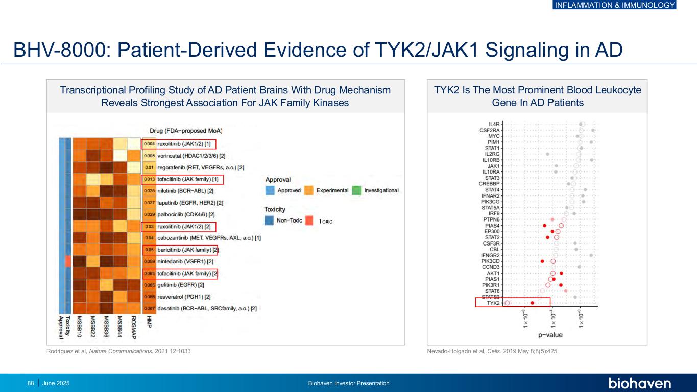 Transcriptional Profiling Study of AD Patient Brains With Drug Mechanism  Reveals Strongest Association For JAK Family Kinases  BHV-8000: Patient-Derived Evidence of TYK2/JAK1 Signaling in AD TYK2 Is The Most Prominent Blood Leukocyte  Gene In AD Patients g e n e Nevado-Holgado et al, Cells. 2019 May 8;8(5):425 Rodriguez et al, Nature Communications. 2021 12:1033 Toxic INFLAMMATION & IMMUNOLOGY June 2025 Biohaven Investor Presentation88