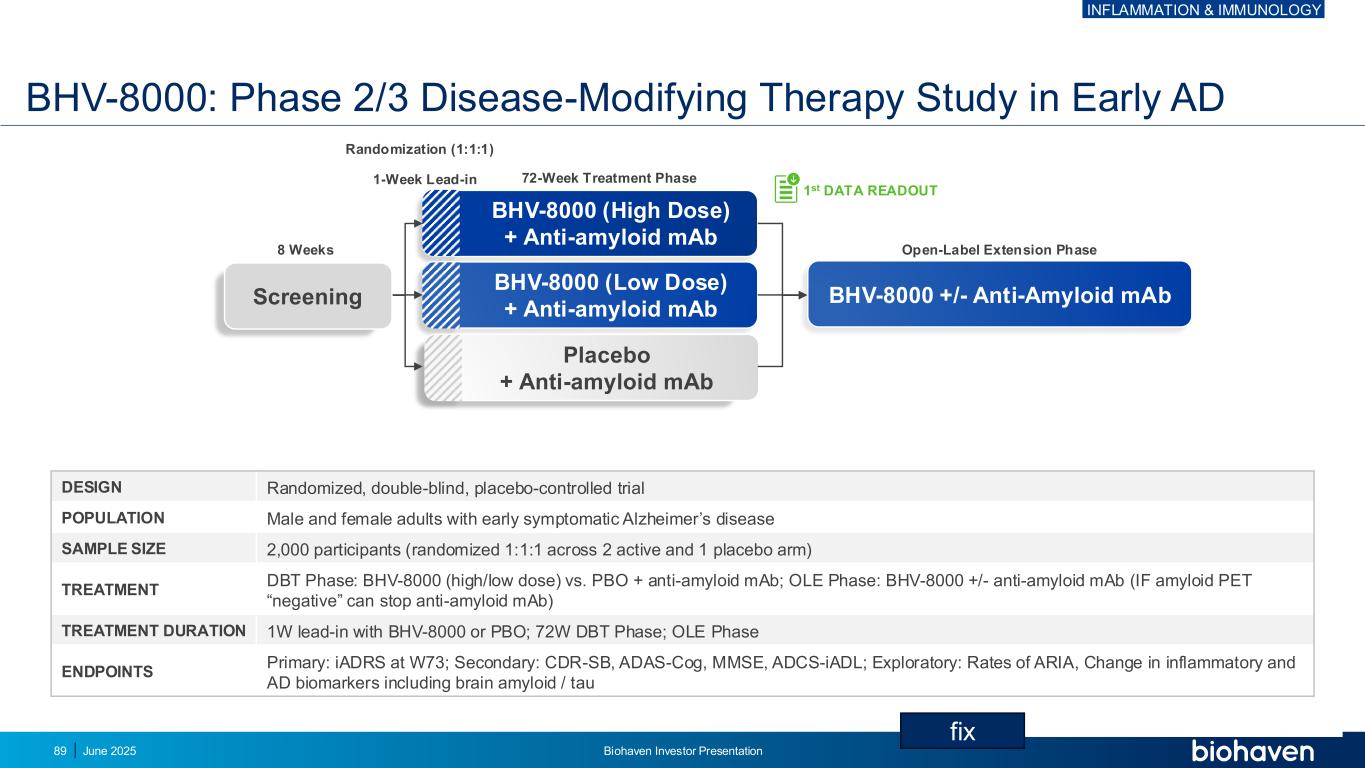 BHV-8000: Phase 2/3 Disease-Modifying Therapy Study in Early AD DESIGN Randomized, double-blind, placebo-controlled trial POPULATION Male and female adults with early symptomatic Alzheimer’s disease SAMPLE SIZE 2,000 participants (randomized 1:1:1 across 2 active and 1 placebo arm) TREATMENT  DBT Phase: BHV-8000 (high/low dose) vs. PBO + anti-amyloid mAb; OLE Phase: BHV-8000 +/- anti-amyloid mAb (IF amyloid PET  “negative” can stop anti-amyloid mAb)   TREATMENT DURATION 1W lead-in with BHV-8000 or PBO; 72W DBT Phase; OLE Phase ENDPOINTS Primary: iADRS at W73; Secondary: CDR-SB, ADAS-Cog, MMSE, ADCS-iADL; Exploratory: Rates of ARIA, Change in inflammatory and  AD biomarkers including brain amyloid / tau BHV-8000 +/- Anti-Amyloid mAb BHV-8000 (High Dose)  + Anti-amyloid mAb BHV-8000 (Low Dose) + Anti-amyloid mAb Placebo + Anti-amyloid mAb 72-Week Treatment Phase1-Week Lead-in Randomization (1:1:1) Open-Label Extension Phase8 Weeks 1st DATA READOUT Screening INFLAMMATION & IMMUNOLOGY June 2025 Biohaven Investor Presentation89 fix