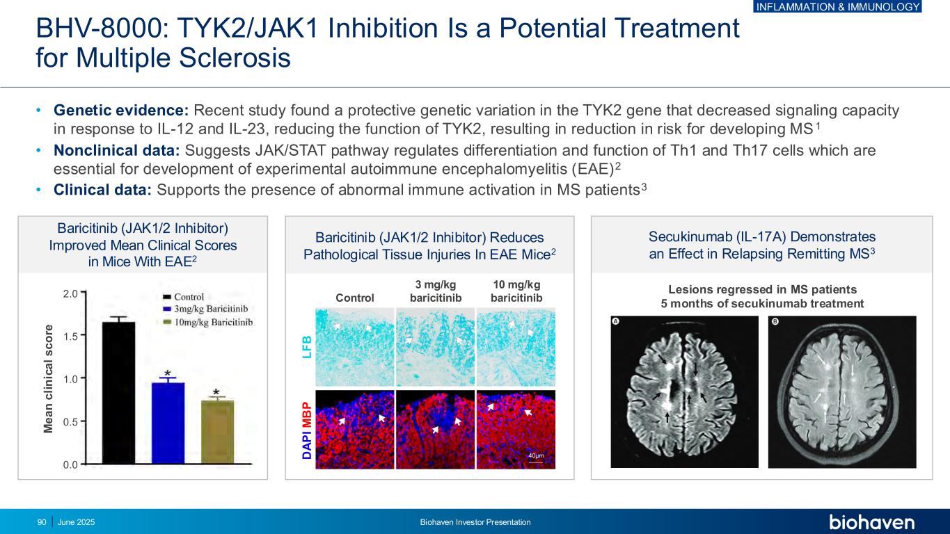 BHV-8000: TYK2/JAK1 Inhibition Is a Potential Treatment  for Multiple Sclerosis • Genetic evidence: Recent study found a protective genetic variation in the TYK2 gene that decreased signaling capacity  in response to IL-12 and IL-23, reducing the function of TYK2, resulting in reduction in risk for developing MS 1 • Nonclinical data: Suggests JAK/STAT pathway regulates differentiation and function of Th1 and Th17 cells which are  essential for development of experimental autoimmune encephalomyelitis (EAE)2 • Clinical data: Supports the presence of abnormal immune activation in MS patients3 Secukinumab (IL-17A) Demonstrates  an Effect in Relapsing Remitting MS3 Baricitinib (JAK1/2 Inhibitor) Reduces  Pathological Tissue Injuries In EAE Mice2 Baricitinib (JAK1/2 Inhibitor)  Improved Mean Clinical Scores  in Mice With EAE2 Lesions regressed in MS patients  5 months of secukinumab treatment M e a n  c li n ic a l  s c o re 2.0 1.5 1.0 0.5 0.0 Control 3 mg/kg baricitinib 10 mg/kg baricitinib L F B D A P I  M B P INFLAMMATION & IMMUNOLOGY June 2025 Biohaven Investor Presentation90