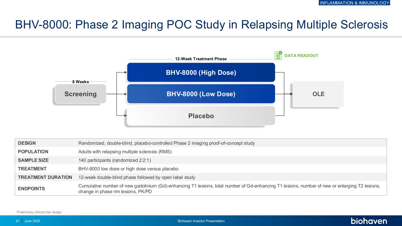 BHV-8000 (High Dose)  BHV-8000 (Low Dose) Placebo Screening BHV-8000: Phase 2 Imaging POC Study in Relapsing Multiple Sclerosis Preliminary clinical trial design DESIGN Randomized, double-blind, placebo-controlled Phase 2 imaging proof-of-concept study POPULATION Adults with relapsing multiple sclerosis (RMS) SAMPLE SIZE 140 participants (randomized 2:2:1) TREATMENT BHV-8000 low dose or high dose versus placebo TREATMENT DURATION 12-week double-blind phase followed by open label study ENDPOINTS Cumulative number of new gadolinium (Gd)-enhancing T1 lesions, total number of Gd-enhancing T1 lesions, number of new or enlarging T2 lesions,  change in phase rim lesions, PK/PD 8 Weeks 12-Week Treatment Phase DATA READOUT OLE INFLAMMATION & IMMUNOLOGY June 2025 Biohaven Investor Presentation91