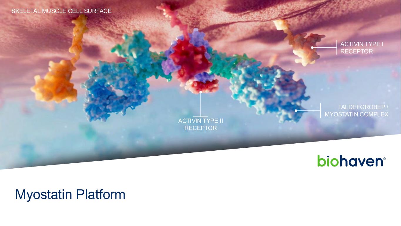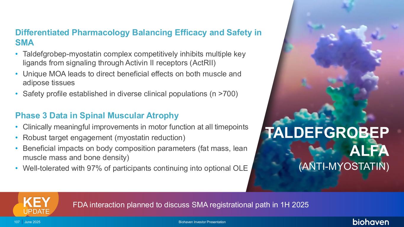 June 2025 Biohaven Investor Presentation107 Differentiated Pharmacology Balancing Efficacy and Safety in  SMA • Taldefgrobep-myostatin complex competitively inhibits multiple key  ligands from signaling through Activin II receptors (ActRII) • Unique MOA leads to direct beneficial effects on both muscle and  adipose tissues • Safety profile established in diverse clinical populations (n >700) Phase 3 Data in Spinal Muscular Atrophy  • Clinically meaningful improvements in motor function at all timepoints • Robust target engagement (myostatin reduction) • Beneficial impacts on body composition parameters (fat mass, lean  muscle mass and bone density) • Well-tolerated with 97% of participants continuing into optional OLE TALDEFGROBEP  ALFA (ANTI-MYOSTATIN) FDA interaction planned to discuss SMA registrational path in 1H 2025KEY  UPDATE