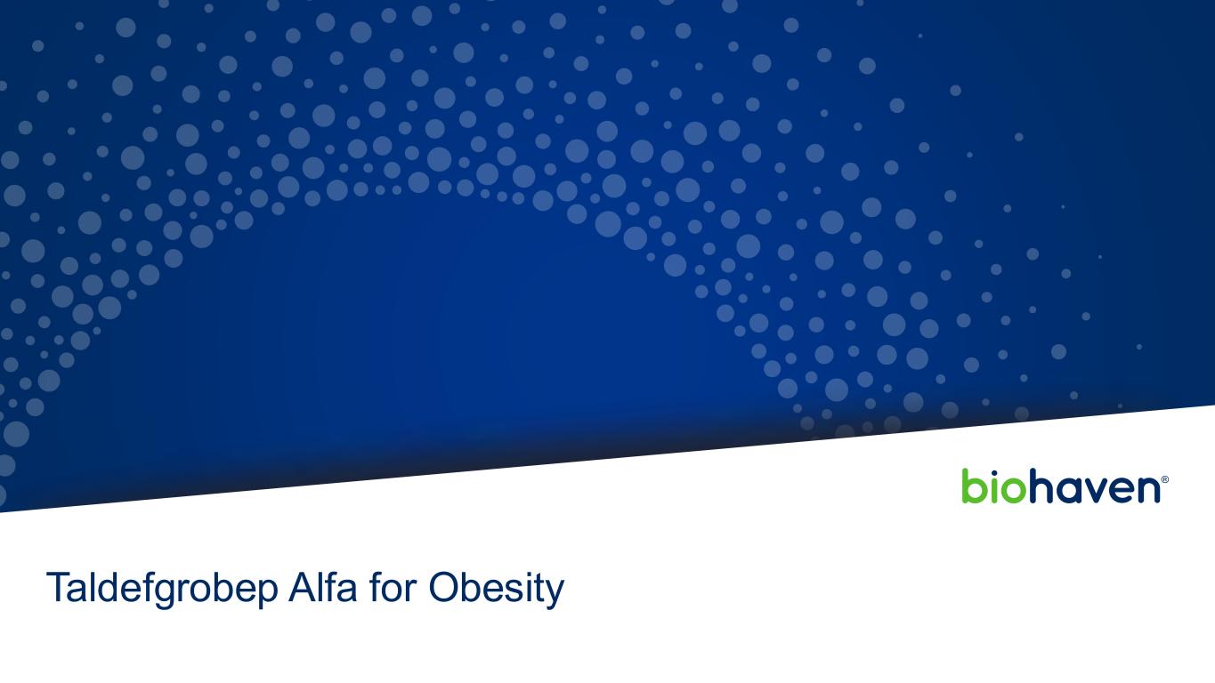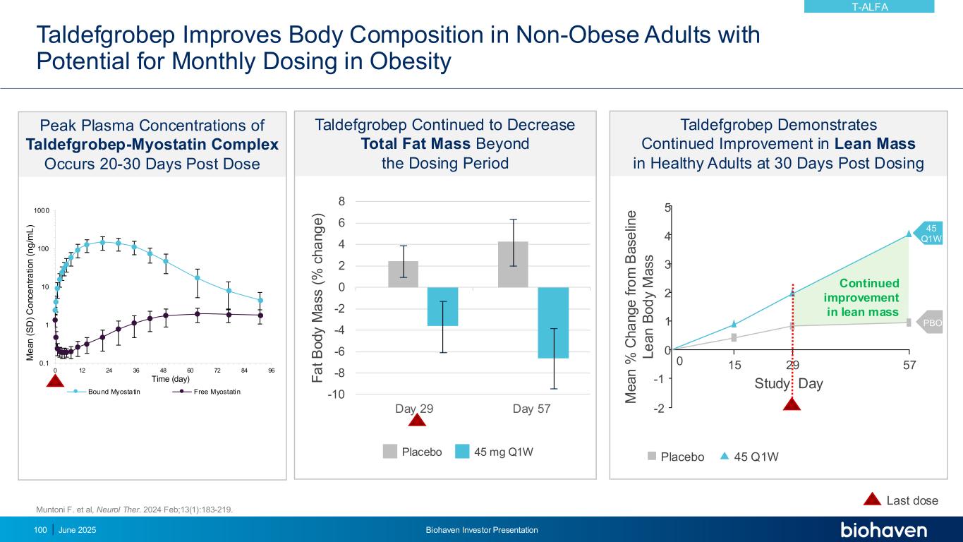 Taldefgrobep Improves Body Composition in Non-Obese Adults with  Potential for Monthly Dosing in Obesity June 2025 Biohaven Investor Presentation100 Muntoni F. et al, Neurol Ther. 2024 Feb;13(1):183-219.   Taldefgrobep Continued to Decrease  Total Fat Mass Beyond  the Dosing Period Placebo 45 mg Q1W Last dose -10 -8 -6 -4 -2 0 2 4 6 8 Day 29 Day 57 F a t  B o d y  M a s s  ( %  c h a n g e ) Peak Plasma Concentrations of  Taldefgrobep-Myostatin Complex  Occurs 20-30 Days Post Dose   Taldefgrobep Demonstrates  Continued Improvement in Lean Mass  in Healthy Adults at 30 Days Post Dosing 45  Q1W 5 4 3 2 1 0 -1 -2 0 15 29 57 M e a n  %  C h a n g e  f ro m  B a s e lin e L e a n  B o d y  M a s s Study  Day Continued  improvement  in lean mass PBO Placebo 45 Q1W 0.1 1 10 100 1000 0 12 24 36 48 60 72 84 96 M e a n  ( S D )  C o n c e n tr a ti o n  ( n g /m L ) Time (day) Bound Myostatin Free Myostatin T-ALFA