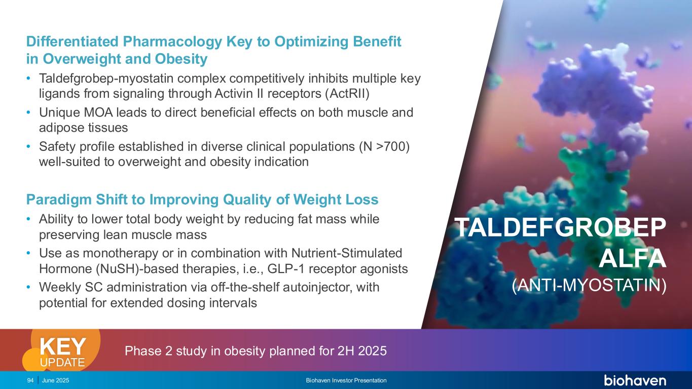 June 2025 Biohaven Investor Presentation94 Differentiated Pharmacology Key to Optimizing Benefit in Overweight and Obesity • Taldefgrobep-myostatin complex competitively inhibits multiple key  ligands from signaling through Activin II receptors (ActRII) • Unique MOA leads to direct beneficial effects on both muscle and  adipose tissues • Safety profile established in diverse clinical populations (N >700)  well-suited to overweight and obesity indication Paradigm Shift to Improving Quality of Weight Loss • Ability to lower total body weight by reducing fat mass while  preserving lean muscle mass • Use as monotherapy or in combination with Nutrient-Stimulated  Hormone (NuSH)-based therapies, i.e., GLP-1 receptor agonists • Weekly SC administration via off-the-shelf autoinjector, with  potential for extended dosing intervals  TALDEFGROBEP  ALFA (ANTI-MYOSTATIN) Phase 2 study in obesity planned for 2H 2025KEY  UPDATE