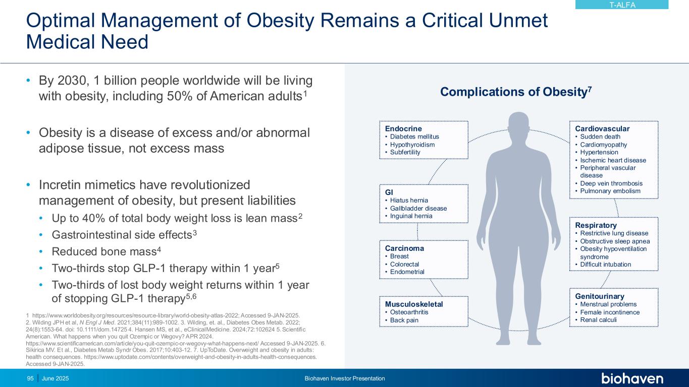 Optimal Management of Obesity Remains a Critical Unmet  Medical Need • By 2030, 1 billion people worldwide will be living  with obesity, including 50% of American adults1 • Obesity is a disease of excess and/or abnormal  adipose tissue, not excess mass • Incretin mimetics have revolutionized  management of obesity, but present liabilities • Up to 40% of total body weight loss is lean mass2 • Gastrointestinal side effects3 • Reduced bone mass4 • Two-thirds stop GLP-1 therapy within 1 year5 • Two-thirds of lost body weight returns within 1 year  of stopping GLP-1 therapy5,6 Endocrine • Diabetes mellitus • Hypothyroidism • Subfertility GI • Hiatus hernia • Gallbladder disease • Inguinal hernia Carcinoma • Breast • Colorectal • Endometrial Musculoskeletal • Osteoarthritis • Back pain Cardiovascular • Sudden death • Cardiomyopathy • Hypertension • Ischemic heart disease • Peripheral vascular  disease • Deep vein thrombosis • Pulmonary embolism Respiratory • Restrictive lung disease • Obstructive sleep apnea • Obesity hypoventilation  syndrome • Difficult intubation Genitourinary • Menstrual problems • Female incontinence • Renal calculi Complications of Obesity7 1  https://www.worldobesity.org/resources/resource-library/world-obesity-atlas-2022; Accessed 9-JAN-2025.  2. Wilding JPH et al, N Engl J Med. 2021;384(11):989-1002. 3. Wilding, et. al., Diabetes Obes Metab. 2022;  24(8):1553-64. doi: 10.1111/dom.14725 4. Hansen MS, et al., eClinicalMedicine. 2024;72:102624 5. Scientific  American. What happens when you quit Ozempic or Wegovy? APR 2024.  https://www.scientificamerican.com/article/you-quit-ozempic-or-wegovy-what-happens-next/ Accessed 9-JAN-2025. 6.  Sikirica MV. Et al., Diabetes Metab Syndr Obes. 2017;10:403-12. 7. UpToDate. Overweight and obesity in adults:  health consequences. https://www.uptodate.com/contents/overweight-and-obesity-in-adults-health-consequences.  Accessed 9-JAN-2025.  T-ALFA June 2025 Biohaven Investor Presentation95