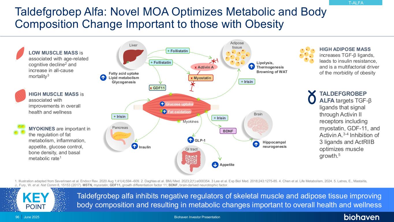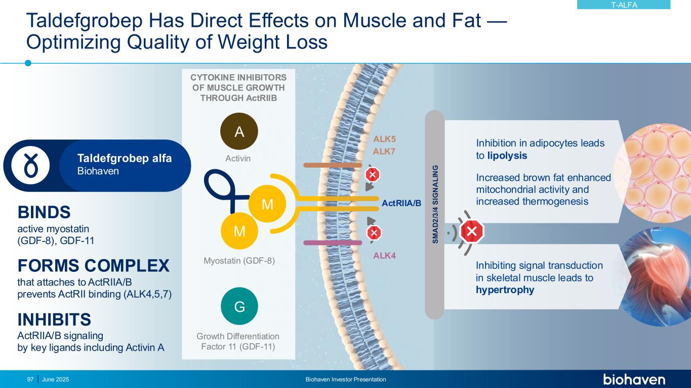 Taldefgrobep Alfa: Novel MOA Optimizes Metabolic and Body  Composition Change Important to those with Obesity 1. Illustration adapted from Severinsen et al. Endocr Rev. 2020 Aug 1;41(4):594–609. 2. Daghlas et al. BMJ Med. 2023;2(1):e000354. 3 Lee et al. Exp Biol Med. 2018;243:1275-85. 4. Chen et al. Life Metabolism, 2024. 5. Latres, E., Mastaitis,  J., Fury, W. et al. Nat Comm 8, 15153 (2017). MSTN, myostatin; GDF11, growth differentiation factor 11; BDNF, brain-derived neurotrophic factor.  Lipolysis,  Thermogenesis Browning of WAT Appetite GLP-1 Fatty acid uptake Lipid metabolism Glycogenesis Insulin Glucose uptake Fat oxidation Brain Myokines GI tract + Irisin+ Irisin BDNF Pancreas Liver x GDF11 Adipose  tissue + Irisin x Myostatin x Activin A + Follistatin Hippocampal neurogenesis + Follistatin LOW MUSCLE MASS is  associated with age-related  cognitive decline2 and  increase in all-cause  mortality3 HIGH MUSCLE MASS is  associated with  improvements in overall  health and wellness MYOKINES are important in  the regulation of fat  metabolism, inflammation,  appetite, glucose control,  bone density, and basal  metabolic rate1 HIGH ADIPOSE MASS  increases TGF-β ligands,  leads to insulin resistance,  and is a multifactorial driver  of the morbidity of obesity TALDEFGROBEP  ALFA targets TGF-β  ligands that signal  through Activin II  receptors including  myostatin, GDF-11, and  Activin A.3-4 Inhibition of  3 ligands and ActRIIB  optimizes muscle  growth.5 T-ALFA June 2025 Biohaven Investor Presentation96 Taldefgrobep alfa inhibits negative regulators of skeletal muscle and adipose tissue improving  body composition and resulting in metabolic changes important to overall health and wellness  KEY  POINT