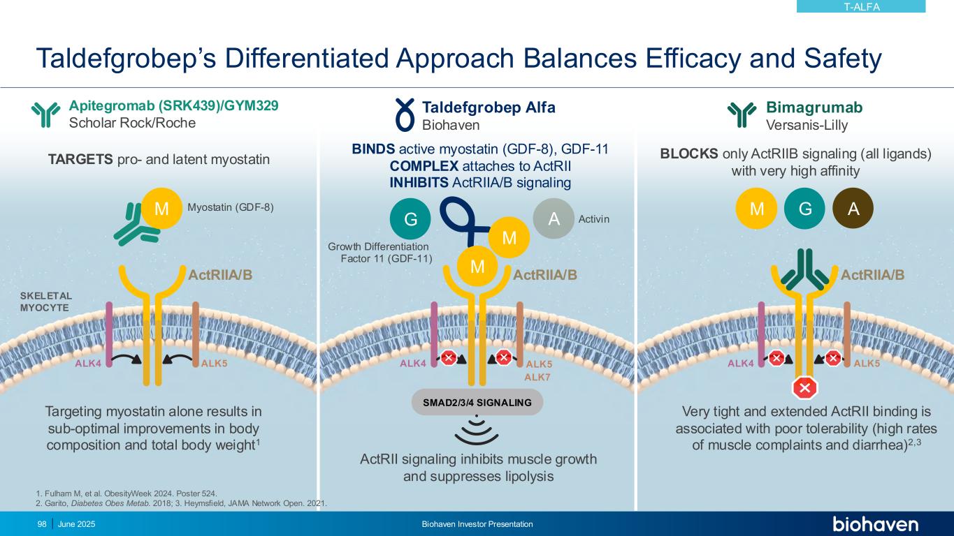 Taldefgrobep Has Direct Effects on Muscle and Fat —  Optimizing Quality of Weight Loss June 2025 Biohaven Investor Presentation97 BINDS active myostatin (GDF-8), GDF-11 FORMS COMPLEX that attaches to ActRIIA/B  prevents ActRII binding (ALK4,5,7) INHIBITS ActRIIA/B signaling  by key ligands including Activin A S M A D 2 /3 /4  S IG N A L IN G ALK4 ALK5 ActRIIA/BM M G ALK7 A Myostatin (GDF-8) Growth Differentiation  Factor 11 (GDF-11) Activin CYTOKINE INHIBITORS  OF MUSCLE GROWTH  THROUGH ActRIIB Inhibiting signal transduction  in skeletal muscle leads to  hypertrophy Inhibition in adipocytes leads  to lipolysis Increased brown fat enhanced  mitochondrial activity and  increased thermogenesis Taldefgrobep alfa Biohaven T-ALFA