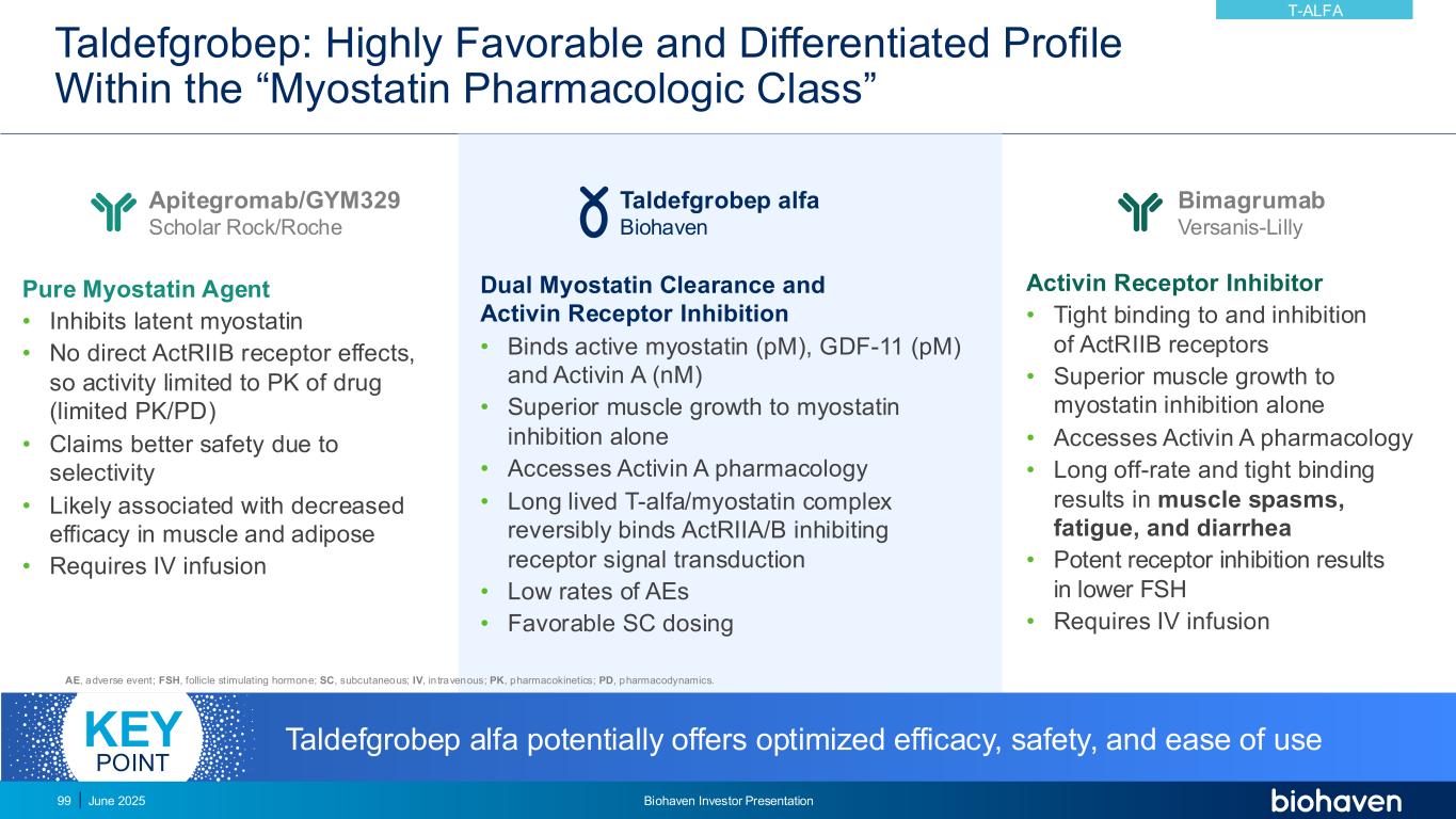 Taldefgrobep: Highly Favorable and Differentiated Profile Within the “Myostatin Pharmacologic Class” Pure Myostatin Agent • Inhibits latent myostatin • No direct ActRIIB receptor effects,  so activity limited to PK of drug  (limited PK/PD) • Claims better safety due to  selectivity • Likely associated with decreased  efficacy in muscle and adipose • Requires IV infusion Activin Receptor Inhibitor • Tight binding to and inhibition  of ActRIIB receptors • Superior muscle growth to  myostatin inhibition alone • Accesses Activin A pharmacology • Long off-rate and tight binding  results in muscle spasms,  fatigue, and diarrhea  • Potent receptor inhibition results  in lower FSH • Requires IV infusion Dual Myostatin Clearance and  Activin Receptor Inhibition • Binds active myostatin (pM), GDF-11 (pM)  and Activin A (nM) • Superior muscle growth to myostatin  inhibition alone • Accesses Activin A pharmacology • Long lived T-alfa/myostatin complex  reversibly binds ActRIIA/B inhibiting  receptor signal transduction • Low rates of AEs  • Favorable SC dosing Apitegromab/GYM329 Scholar Rock/Roche Taldefgrobep alfa Biohaven Bimagrumab Versanis-Lilly AE, adverse event; FSH, follicle stimulating hormone; SC, subcutaneous; IV, in travenous; PK, pharmacokinetics; PD, pharmacodynamics.  Taldefgrobep alfa potentially offers optimized efficacy, safety, and ease of useKEY  POINT T-ALFA June 2025 Biohaven Investor Presentation99