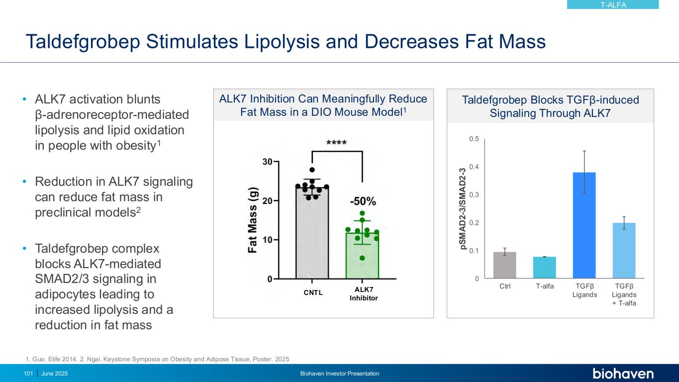 ALK7 Inhibition Can Meaningfully Reduce  Fat Mass in a DIO Mouse Model1  Taldefgrobep Stimulates Lipolysis and Decreases Fat Mass June 2025 Biohaven Investor Presentation101 • ALK7 activation blunts  β-adrenoreceptor-mediated  lipolysis and lipid oxidation  in people with obesity1 • Reduction in ALK7 signaling  can reduce fat mass in  preclinical models2 • Taldefgrobep complex  blocks ALK7-mediated  SMAD2/3 signaling in  adipocytes leading to  increased lipolysis and a  reduction in fat mass  ALK7  Inhibitor CNTL 1. Guo. Elife 2014. 2. Ngai. Keystone Symposia on Obesity and Adipose Tissue, Poster. 2025 Taldefgrobep Blocks TGFβ-induced  Signaling Through ALK7 0 0.1 0.2 0.3 0.4 0.5 1 2 3 4 p S M A D 2 -3 /S M A D 2 -3 Ctrl T-alfa TGFβ Ligands TGFβ  Ligands  + T-alfa T-ALFA