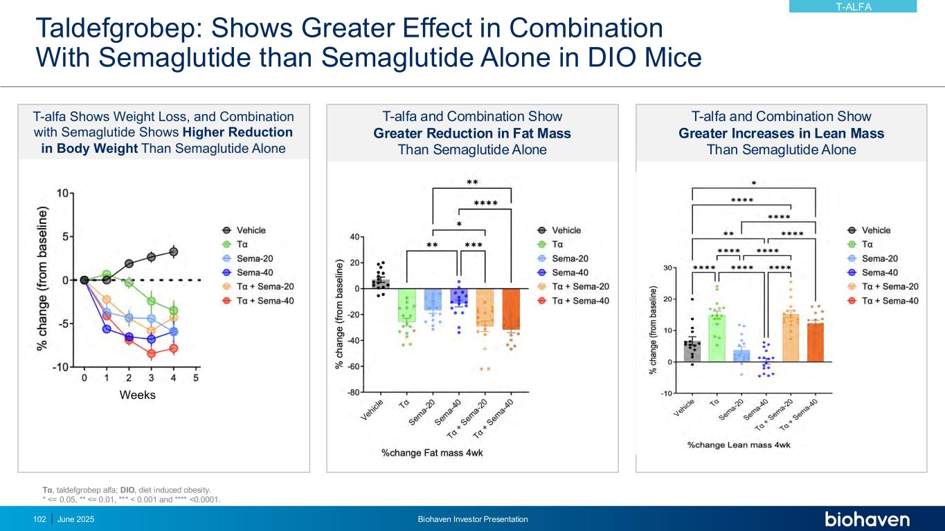 Taldefgrobep: Shows Greater Effect in Combination  With Semaglutide than Semaglutide Alone in DIO Mice T-alfa Shows Weight Loss, and Combination  with Semaglutide Shows Higher Reduction  in Body Weight Than Semaglutide Alone  Weeks T-alfa and Combination Show  Greater Reduction in Fat Mass  Than Semaglutide Alone  T-alfa and Combination Show  Greater Increases in Lean Mass  Than Semaglutide Alone Tα, taldefgrobep alfa; DIO, diet induced obesity. * <= 0.05, ** <= 0.01, *** < 0.001 and **** <0.0001.  T-ALFA June 2025 Biohaven Investor Presentation102