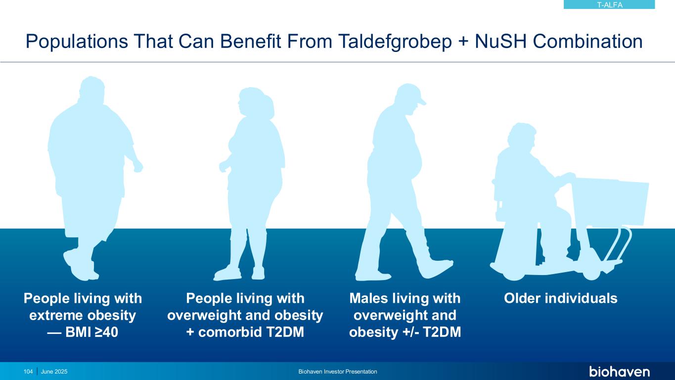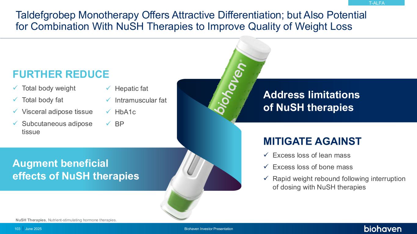 Taldefgrobep Monotherapy Offers Attractive Differentiation; but Also Potential  for Combination With NuSH Therapies to Improve Quality of Weight Loss June 2025 Biohaven Investor Presentation103 MITIGATE AGAINST  ✓ Excess loss of lean mass  ✓ Excess loss of bone mass ✓ Rapid weight rebound following interruption  of dosing with NuSH therapies ✓ Hepatic fat ✓ Intramuscular fat  ✓ HbA1c  ✓ BP Augment beneficial  effects of NuSH therapies  Address limitations  of NuSH therapies FURTHER REDUCE ✓ Total body weight ✓ Total body fat ✓ Visceral adipose tissue ✓ Subcutaneous adipose  tissue  NuSH Therapies, Nutrient-stimulating hormone therapies. T-ALFA