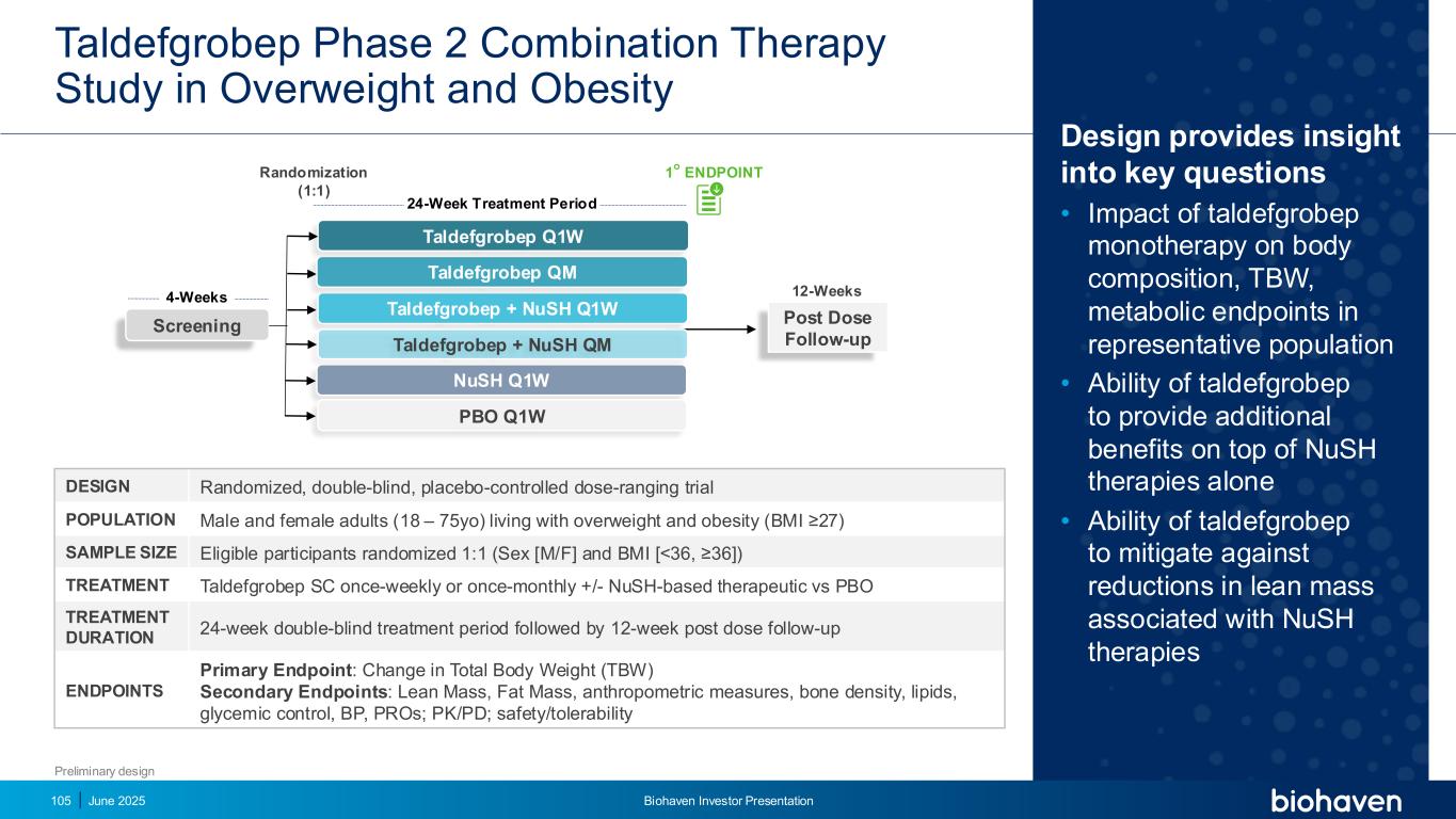 Design provides insight  into key questions • Impact of taldefgrobep  monotherapy on body  composition, TBW,  metabolic endpoints in  representative population • Ability of taldefgrobep  to provide additional  benefits on top of NuSH  therapies alone • Ability of taldefgrobep  to mitigate against  reductions in lean mass  associated with NuSH  therapies June 2025 Biohaven Investor Presentation105 Taldefgrobep Phase 2 Combination Therapy  Study in Overweight and Obesity DESIGN Randomized, double-blind, placebo-controlled dose-ranging trial POPULATION Male and female adults (18 – 75yo) living with overweight and obesity (BMI ≥27) SAMPLE SIZE Eligible participants randomized 1:1 (Sex [M/F] and BMI [<36, ≥36]) TREATMENT Taldefgrobep SC once-weekly or once-monthly +/- NuSH-based therapeutic vs PBO TREATMENT  DURATION  24-week double-blind treatment period followed by 12-week post dose follow-up ENDPOINTS Primary Endpoint: Change in Total Body Weight (TBW) Secondary Endpoints: Lean Mass, Fat Mass, anthropometric measures, bone density, lipids,  glycemic control, BP, PROs; PK/PD; safety/tolerability 12-Weeks4-Weeks 24-Week Treatment Period Screening Randomization (1:1) Post Dose  Follow-up Taldefgrobep + NuSH Q1W NuSH Q1W 1⚬ ENDPOINT Taldefgrobep + NuSH QM Taldefgrobep QM Taldefgrobep Q1W PBO Q1W Preliminary design