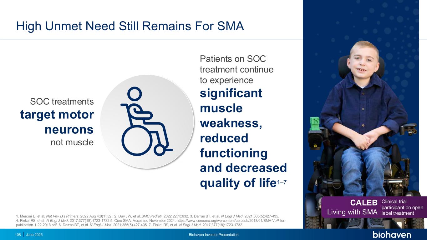 High Unmet Need Still Remains For SMA 1. Mercuri E, et al. Nat Rev Dis Primers. 2022 Aug 4;8(1):52 . 2. Day JW, et al. BMC Pediatr. 2022;22(1):632. 3. Darras BT, et al. N Engl J Med. 2021;385(5):427-435. 4. Finkel RS, et al. N Engl J Med. 2017;377(18):1723-1732 5. Cure SMA. Accessed November 2024. https://www.curesma.org/wp-content/uploads/2018/01/SMA-VoP-for- publication-1-22-2018.pdf. 6. Darras BT, et al. N Engl J Med. 2021;385(5):427-435. 7. Finkel RS, et al. N Engl J Med. 2017;377(18):1723-1732. SOC treatments  target motor  neurons not muscle Patients on SOC  treatment continue to experience  significant  muscle  weakness,  reduced  functioning  and decreased  quality of life1–7 CALEB   Living with SMA Clinical trial  participant on open  label treatment June 2025 Biohaven Investor Presentation108