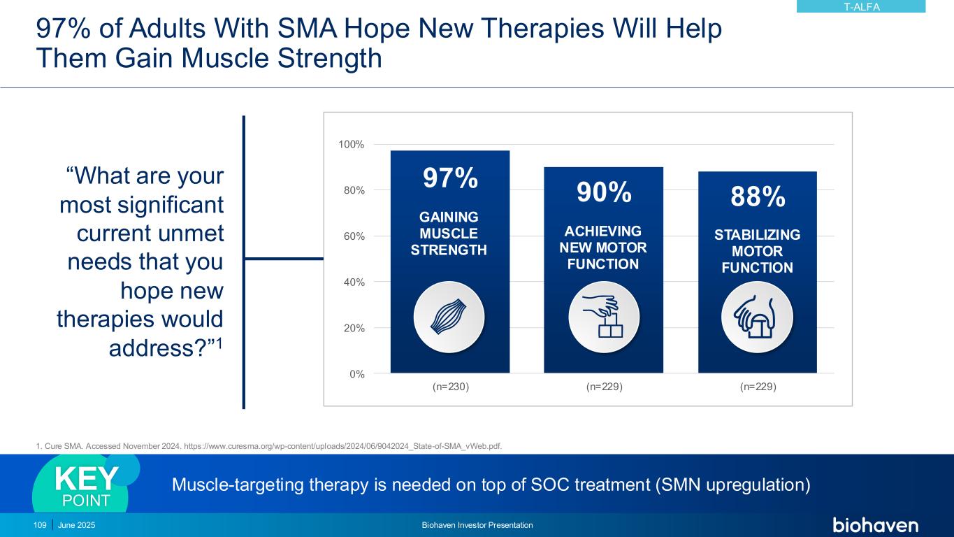 “What are your  most significant  current unmet  needs that you  hope new  therapies would  address?”1 97% of Adults With SMA Hope New Therapies Will Help  Them Gain Muscle Strength 1. Cure SMA. Accessed November 2024. https://www.curesma.org/wp-content/uploads/2024/06/9042024_State-of-SMA_vWeb.pdf. 97% 90% 88% 0% 20% 40% 60% 80% 100% (n=230) (n=229) (n=229) GAINING  MUSCLE  STRENGTH ACHIEVING  NEW MOTOR  FUNCTION STABILIZING  MOTOR  FUNCTION Muscle-targeting therapy is needed on top of SOC treatment (SMN upregulation)KEY  POINT June 2025 Biohaven Investor Presentation109 T-ALFA