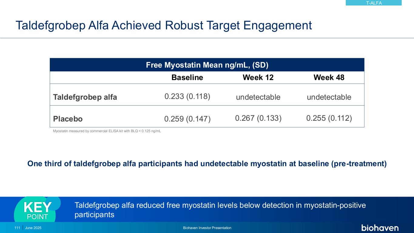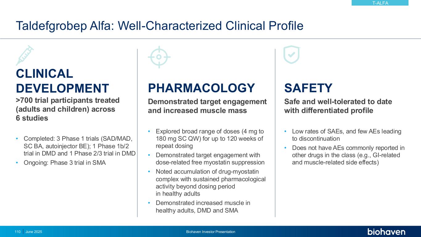 Taldefgrobep Alfa: Well-Characterized Clinical Profile CLINICAL  DEVELOPMENT  >700 trial participants treated  (adults and children) across  6 studies • Completed: 3 Phase 1 trials (SAD/MAD,  SC BA, autoinjector BE); 1 Phase 1b/2  trial in DMD and 1 Phase 2/3 trial in DMD • Ongoing: Phase 3 trial in SMA PHARMACOLOGY Demonstrated target engagement  and increased muscle mass • Explored broad range of doses (4 mg to  180 mg SC QW) for up to 120 weeks of  repeat dosing • Demonstrated target engagement with  dose-related free myostatin suppression • Noted accumulation of drug-myostatin  complex with sustained pharmacological  activity beyond dosing period  in healthy adults • Demonstrated increased muscle in  healthy adults, DMD and SMA SAFETY Safe and well-tolerated to date  with differentiated profile • Low rates of SAEs, and few AEs leading  to discontinuation • Does not have AEs commonly reported in  other drugs in the class (e.g., GI-related  and muscle-related side effects) June 2025 Biohaven Investor Presentation110 T-ALFA