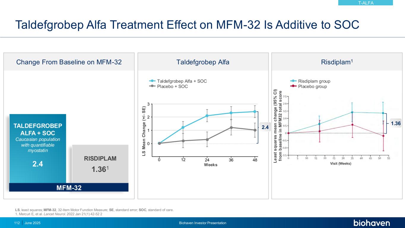 Taldefgrobep Alfa Treatment Effect on MFM-32 Is Additive to SOC MFM-32 TALDEFGROBEP ALFA + SOC Caucasian population  with quantifiable  myostatin 1.361 2.4 RISDIPLAM L e a s t  s q u a re s  m e a n  c h a n g e  ( 9 5 %  C I) fr o m  b a s e li n e  i n  M F M 3 2  t o ta l  s c o re Risdiplam group Placebo group Change From Baseline on MFM-32 Risdiplam1Taldefgrobep Alfa 1.36 Visit (Weeks) LS, least squares; MFM-32, 32-Item Motor Function Measure; SE, standard error; SOC, standard of care. 1. Mercuri E, et al. Lancet Neurol. 2022 Jan 21(1) 42-52 2 0 12 24 36 48 0 1 2 3 L S  M e a n  C h a n g e  ( + /-  S E ) Weeks Taldefgrobep Alfa + SOC Placebo + SOC 2.4 June 2025 Biohaven Investor Presentation112 T-ALFA