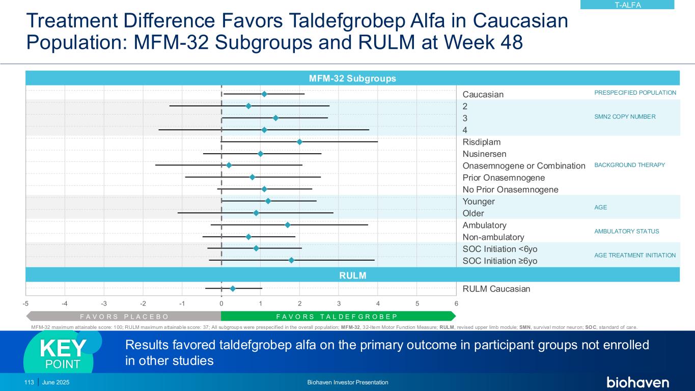 Treatment Difference Favors Taldefgrobep Alfa in Caucasian  Population: MFM-32 Subgroups and RULM at Week 48 Caucasian 2 3 4 Risdiplam Nusinersen Onasemnogene or Combination Prior Onasemnogene No Prior Onasemnogene Younger Older Ambulatory Non-ambulatory SOC Initiation <6yo SOC Initiation ≥6yo F A V O R S  T A L D E F G R O B E PF A V O R S  P L A C E B O Results favored taldefgrobep alfa on the primary outcome in participant groups not enrolled  in other studies KEY  POINT PRESPECIFIED POPULATION SMN2 COPY NUMBER BACKGROUND THERAPY AGE AMBULATORY STATUS AGE TREATMENT INITIATION RULM Caucasian -5 -4 -3 -2 -1 0 1 2 3 4 5 6 MFM-32 Subgroups RULM MFM-32 maximum attainable score: 100; RULM maximum attainable score: 37; All subgroups were prespecified in the overall population; MFM-32, 32-Item Motor Function Measure; RULM, revised upper  limb module; SMN, surviva l motor neuron; SOC, standard of care. June 2025 Biohaven Investor Presentation113 T-ALFA