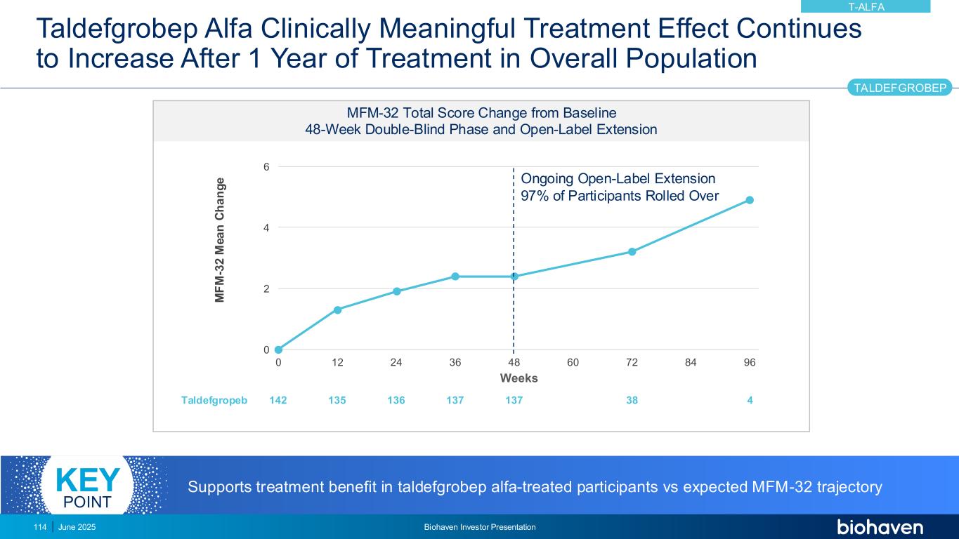 Taldefgrobep Alfa Clinically Meaningful Treatment Effect Continues  to Increase After 1 Year of Treatment in Overall Population MFM-32 Total Score Change from Baseline  48-Week Double-Blind Phase and Open-Label Extension 0 2 4 6 0 12 24 36 48 60 72 84 96 M F M -3 2  M e a n  C h a n g e Weeks Taldefgropeb 142 137 4135 136 137 38 Supports treatment benefit in taldefgrobep alfa-treated participants vs expected MFM-32 trajectoryKEY  POINT June 2025 Biohaven Investor Presentation114 Ongoing Open-Label Extension 97% of Participants Rolled Over TALDEFGROBEP T-ALFA