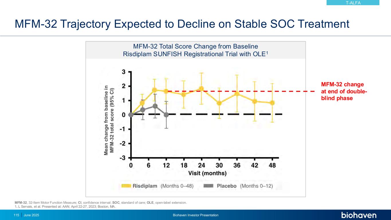 MFM-32 Trajectory Expected to Decline on Stable SOC Treatment MFM-32 Total Score Change from Baseline Risdiplam SUNFISH Registrational Trial with OLE1 MFM-32 change  at end of double- blind phase M e a n  c h a n g e  f ro m  b a s e li n e  i n   M F M -3 2  t o ta l  s c o re  ( 9 5 %  C I) MFM-32, 32-Item Motor Function Measure; CI, confidence interval; SOC, standard of care; OLE, open-label extension. 1. L Servais, et al. Presented at: AAN; April 22-27, 2023; Boston, MA. June 2025 Biohaven Investor Presentation115 T-ALFA