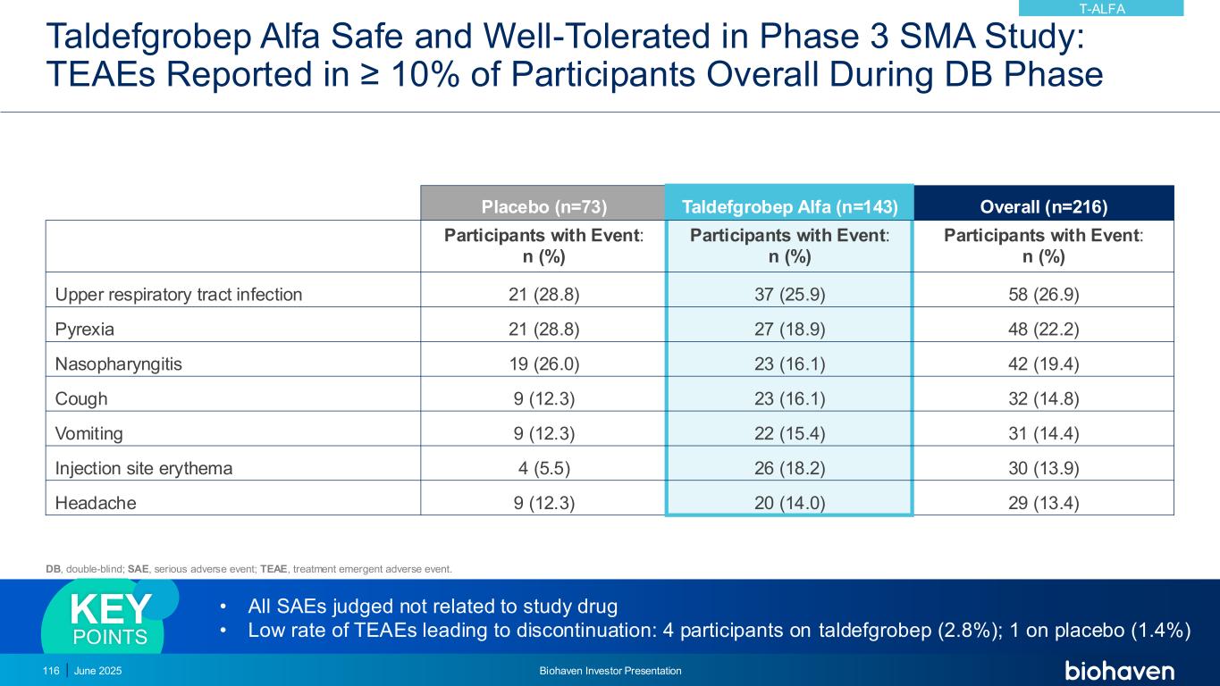 Taldefgrobep Alfa Safe and Well-Tolerated in Phase 3 SMA Study:  TEAEs Reported in ≥ 10% of Participants Overall During DB Phase • All SAEs judged not related to study drug • Low rate of TEAEs leading to discontinuation: 4 participants on taldefgrobep (2.8%); 1 on placebo (1.4%) KEY  POINTS Placebo (n=73) Taldefgrobep Alfa (n=143) Overall (n=216) Participants with Event: n (%) Participants with Event: n (%) Participants with Event: n (%) Upper respiratory tract infection 21 (28.8) 37 (25.9) 58 (26.9) Pyrexia 21 (28.8) 27 (18.9) 48 (22.2) Nasopharyngitis 19 (26.0) 23 (16.1) 42 (19.4) Cough 9 (12.3) 23 (16.1) 32 (14.8) Vomiting 9 (12.3) 22 (15.4) 31 (14.4) Injection site erythema 4 (5.5) 26 (18.2) 30 (13.9) Headache 9 (12.3) 20 (14.0) 29 (13.4) DB, double-blind; SAE, serious adverse event; TEAE, treatment emergent adverse event. June 2025 Biohaven Investor Presentation116 T-ALFA