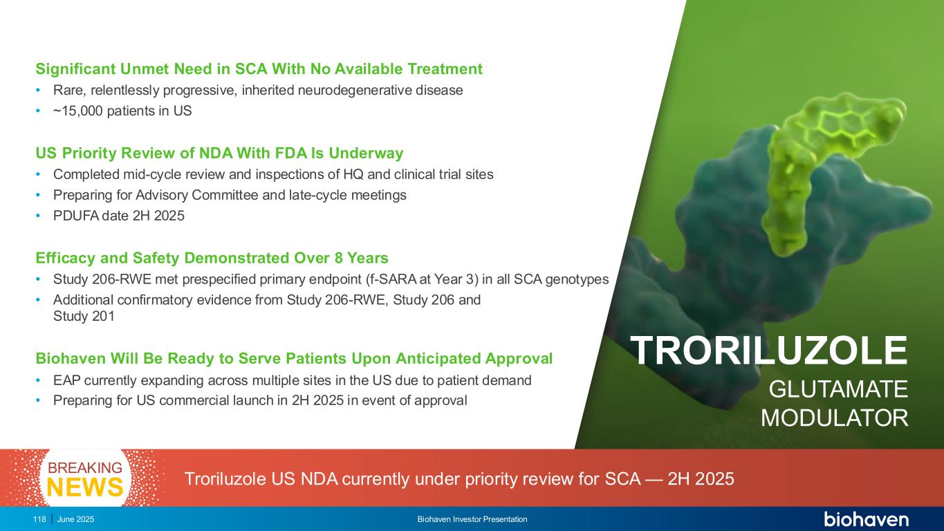 June 2025 Biohaven Investor Presentation118 Significant Unmet Need in SCA With No Available Treatment • Rare, relentlessly progressive, inherited neurodegenerative disease  • ~15,000 patients in US US Priority Review of NDA With FDA Is Underway • Completed mid-cycle review and inspections of HQ and clinical trial sites • Preparing for Advisory Committee and late-cycle meetings • PDUFA date 2H 2025 Efficacy and Safety Demonstrated Over 8 Years • Study 206-RWE met prespecified primary endpoint (f-SARA at Year 3) in all SCA genotypes • Additional confirmatory evidence from Study 206-RWE, Study 206 and  Study 201 Biohaven Will Be Ready to Serve Patients Upon Anticipated Approval • EAP currently expanding across multiple sites in the US due to patient demand • Preparing for US commercial launch in 2H 2025 in event of approval TRORILUZOLE GLUTAMATE  MODULATOR Troriluzole US NDA currently under priority review for SCA — 2H 2025NEWS BREAKING