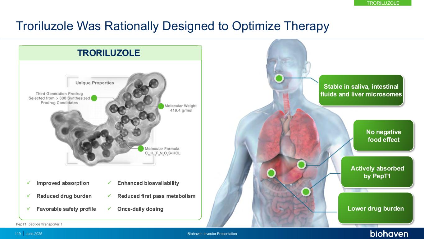 Troriluzole Was Rationally Designed to Optimize Therapy ✓ Improved absorption ✓ Enhanced bioavailability ✓ Reduced drug burden ✓ Reduced first pass metabolism ✓ Favorable safety profile ✓ Once-daily dosing Stable in saliva, intestinal  fluids and liver microsomes No negative  food effect Actively absorbed  by PepT1 Lower drug burden PepT1, peptide ttransporter 1. TRORILUZOLE 119 June 2025 Biohaven Investor Presentation TRORILUZOLE