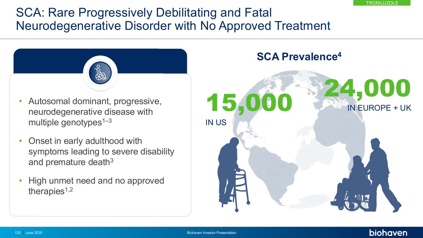 • Autosomal dominant, progressive,  neurodegenerative disease with  multiple genotypes1–3 • Onset in early adulthood with  symptoms leading to severe disability  and premature death3 • High unmet need and no approved  therapies1,2 SCA: Rare Progressively Debilitating and Fatal Neurodegenerative Disorder with No Approved Treatment SCA Prevalence4  24,000 IN EUROPE + UK15,000  IN US TRORILUZOLE June 2025 Biohaven Investor Presentation120