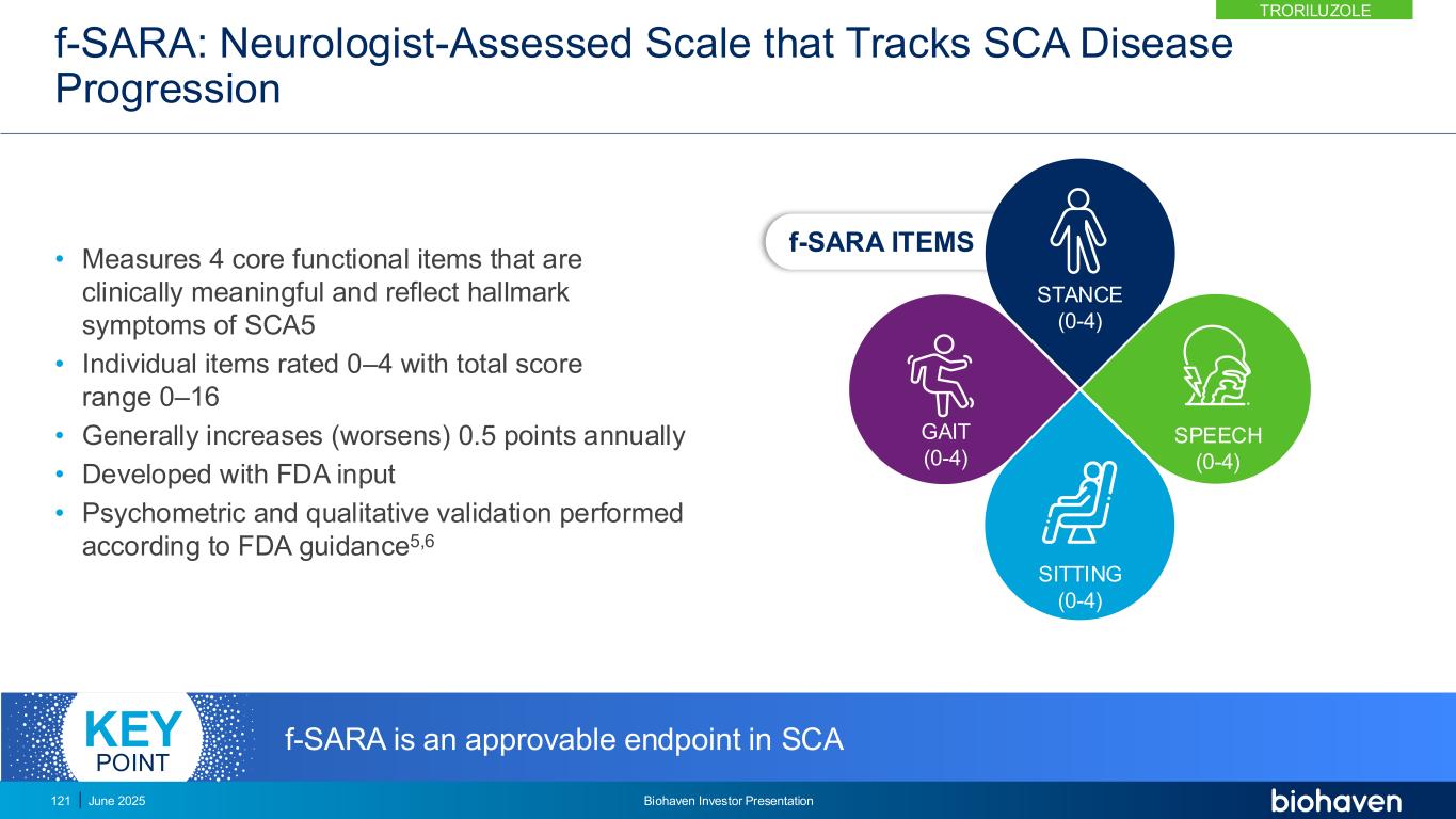 f-SARA: Neurologist-Assessed Scale that Tracks SCA Disease  Progression • Measures 4 core functional items that are  clinically meaningful and reflect hallmark  symptoms of SCA5 • Individual items rated 0–4 with total score  range 0–16  • Generally increases (worsens) 0.5 points annually • Developed with FDA input • Psychometric and qualitative validation performed  according to FDA guidance5,6 f-SARA ITEMS GAIT (0-4) SITTING (0-4) SPEECH (0-4) STANCE (0-4) f-SARA is an approvable endpoint in SCAKEY  POINT TRORILUZOLE June 2025 Biohaven Investor Presentation121
