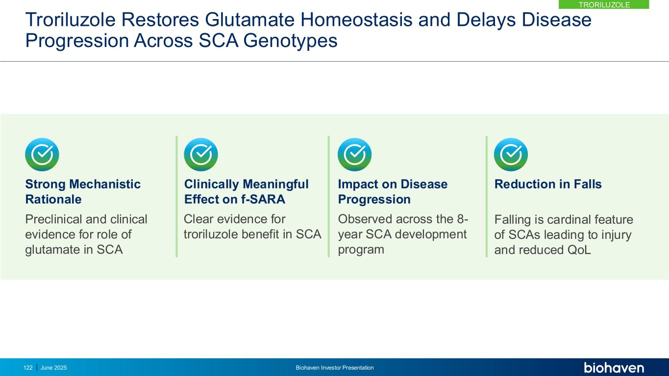 Troriluzole Restores Glutamate Homeostasis and Delays Disease  Progression Across SCA Genotypes Clinically Meaningful  Effect on f-SARA  Strong Mechanistic  Rationale  Preclinical and clinical  evidence for role of  glutamate in SCA Reduction in Falls Falling is cardinal feature  of SCAs leading to injury  and reduced QoL Impact on Disease  Progression  Observed across the 8- year SCA development  program Clear evidence for  troriluzole benefit in SCA 122 June 2025 Biohaven Investor Presentation TRORILUZOLE