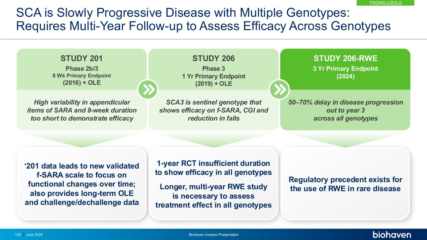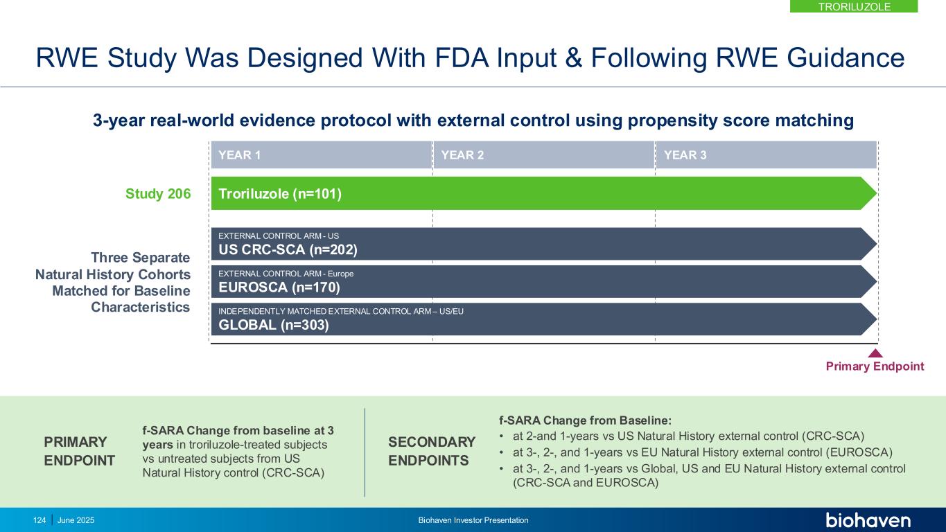 ‘201 data leads to new validated  f-SARA scale to focus on  functional changes over time;  also provides long-term OLE  and challenge/dechallenge data 1-year RCT insufficient duration  to show efficacy in all genotypes Longer, multi-year RWE study  is necessary to assess  treatment effect in all genotypes Regulatory precedent exists for  the use of RWE in rare disease STUDY 201 Phase 2b/3 8 Wk Primary Endpoint (2016) + OLE STUDY 206 Phase 3 1 Yr Primary Endpoint (2019) + OLE STUDY 206-RWE 3 Yr Primary Endpoint (2024) High variability in appendicular  items of SARA and 8-week duration  too short to demonstrate efficacy SCA3 is sentinel genotype that  shows efficacy on f-SARA, CGI and  reduction in falls 50–70% delay in disease progression  out to year 3  across all genotypes SCA is Slowly Progressive Disease with Multiple Genotypes:  Requires Multi-Year Follow-up to Assess Efficacy Across Genotypes  123 June 2025 Biohaven Investor Presentation TRORILUZOLE