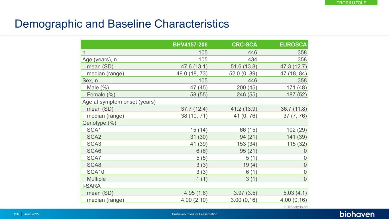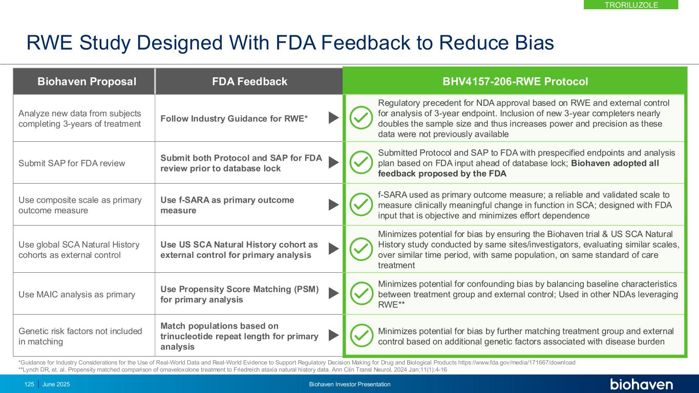 RWE Study Designed With FDA Feedback to Reduce Bias Biohaven Proposal FDA Feedback BHV4157-206-RWE Protocol Analyze new data from subjects  completing 3-years of treatment Follow Industry Guidance for RWE* Regulatory precedent for NDA approval based on RWE and external control for analysis of 3-year endpoint. Inclusion of new 3-year completers nearly  doubles the sample size and thus increases power and precision as these data were not previously available Submit SAP for FDA review Submit both Protocol and SAP for FDA  review prior to database lock Submitted Protocol and SAP to FDA with prespecified endpoints and analysis  plan based on FDA input ahead of database lock; Biohaven adopted all  feedback proposed by the FDA Use composite scale as primary  outcome measure Use f-SARA as primary outcome  measure f-SARA used as primary outcome measure; a reliable and validated scale to  measure clinically meaningful change in function in SCA; designed with FDA  input that is objective and minimizes effort dependence Use global SCA Natural History  cohorts as external control Use US SCA Natural History cohort as  external control for primary analysis Minimizes potential for bias by ensuring the Biohaven trial & US SCA Natural  History study conducted by same sites/investigators, evaluating similar scales,  over similar time period, with same population, on same standard of care  treatment Use MAIC analysis as primary Use Propensity Score Matching (PSM)  for primary analysis Minimizes potential for confounding bias by balancing baseline characteristics  between treatment group and external control; Used in other NDAs leveraging  RWE** Genetic risk factors not included  in matching Match populations based on  trinucleotide repeat length for primary  analysis Minimizes potential for bias by further matching treatment group and external  control based on additional genetic factors associated with disease burden *Guidance for Industry Considerations for the Use of Real-World Data and Real-World Evidence to Support Regulatory Decision Making for Drug and Biological Products https://www.fda.gov/media/171667/download **Lynch DR, et. al. Propensity matched comparison of omaveloxolone treatment to Friedreich ataxia natural history data. Ann Clin Transl Neurol. 2024 Jan;11(1):4-16 TRORILUZOLE June 2025 Biohaven Investor Presentation125