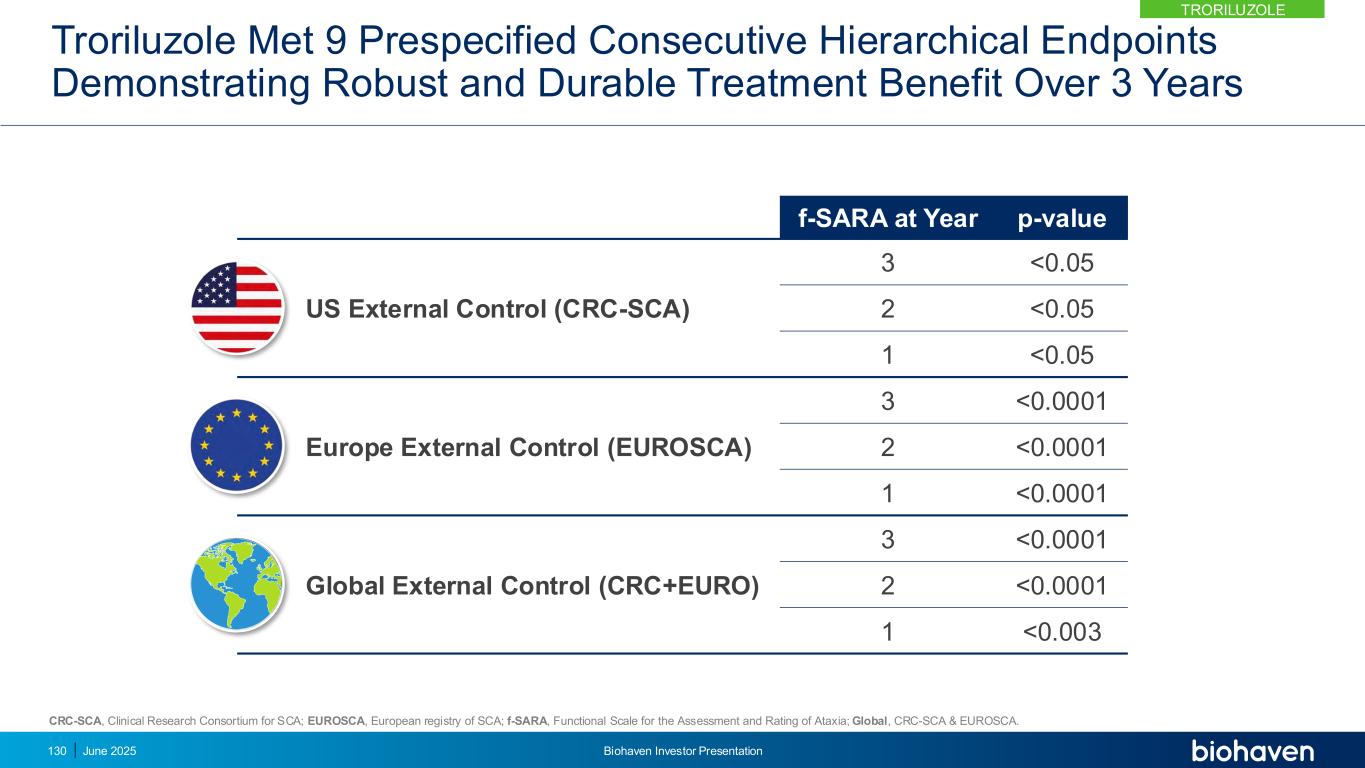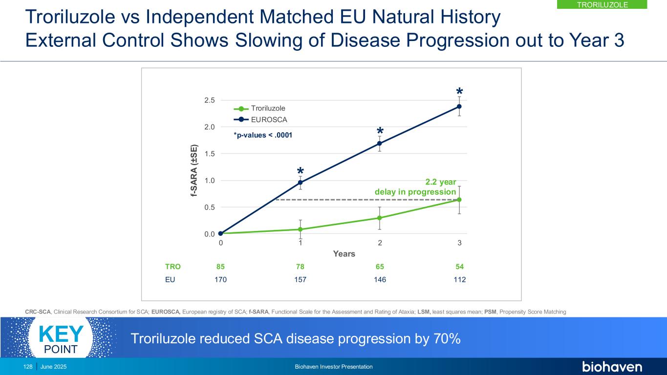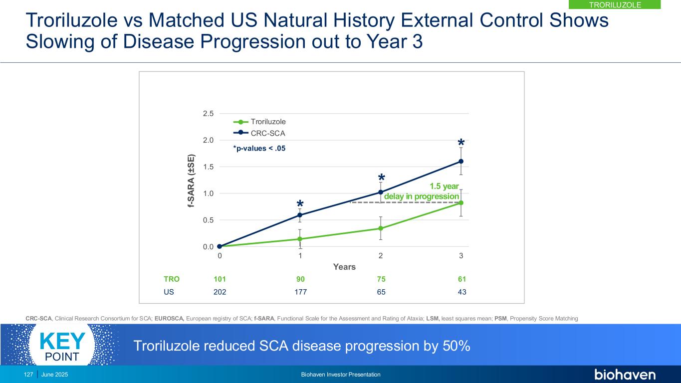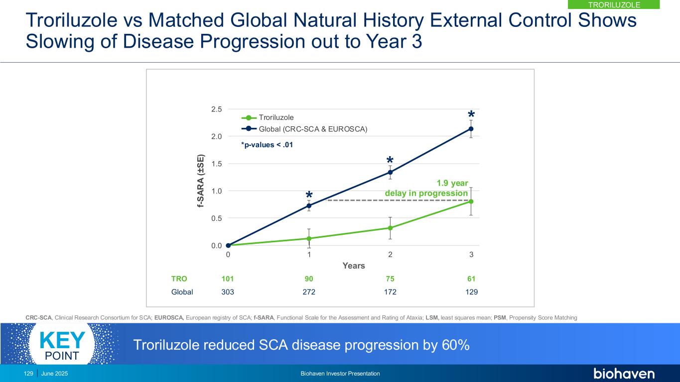 0.0 0.5 1.0 1.5 2.0 2.5 0 1 2 3 f- S A R A  ( ± S E ) Years * * * TRO Global 101 303 90 272 75 172 61 129 *p-values < .01 Troriluzole Global (CRC-SCA & EUROSCA) 1.9 year delay in progression  Troriluzole reduced SCA disease progression by 60%KEY  POINT TRORILUZOLE June 2025 Biohaven Investor Presentation129 Troriluzole vs Matched Global Natural History External Control Shows  Slowing of Disease Progression out to Year 3 CRC-SCA, Clinical Research Consortium for SCA; EUROSCA, European registry of SCA; f-SARA, Functional Scale for the Assessment and Rating of Ataxia; LSM, least squares mean; PSM, Propensity Score Matching
