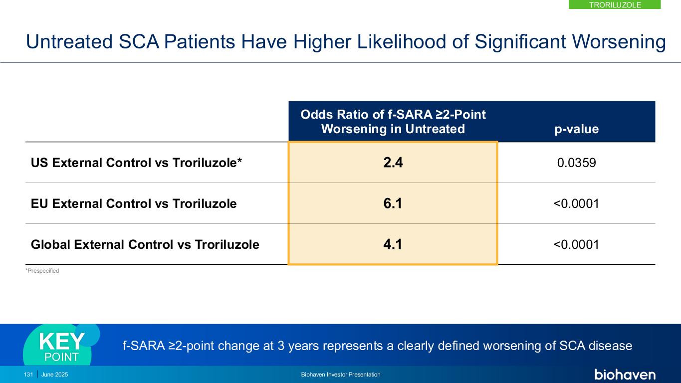 Troriluzole Met 9 Prespecified Consecutive Hierarchical Endpoints  Demonstrating Robust and Durable Treatment Benefit Over 3 Years f-SARA at Year p-value US External Control (CRC-SCA) 3 <0.05 2 <0.05 1 <0.05 Europe External Control (EUROSCA) 3 <0.0001 2 <0.0001 1 <0.0001 Global External Control (CRC+EURO) 3 <0.0001 2 <0.0001 1 <0.003 CRC-SCA, Clinical Research Consortium for SCA; EUROSCA, European registry of SCA; f-SARA, Functional Scale for the Assessment and Rating of Ataxia; Global, CRC-SCA & EUROSCA. 130 June 2025 Biohaven Investor Presentation TRORILUZOLE