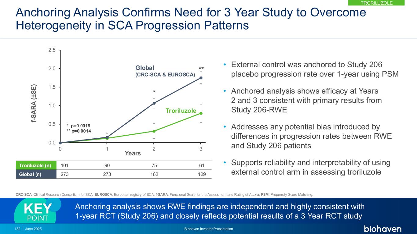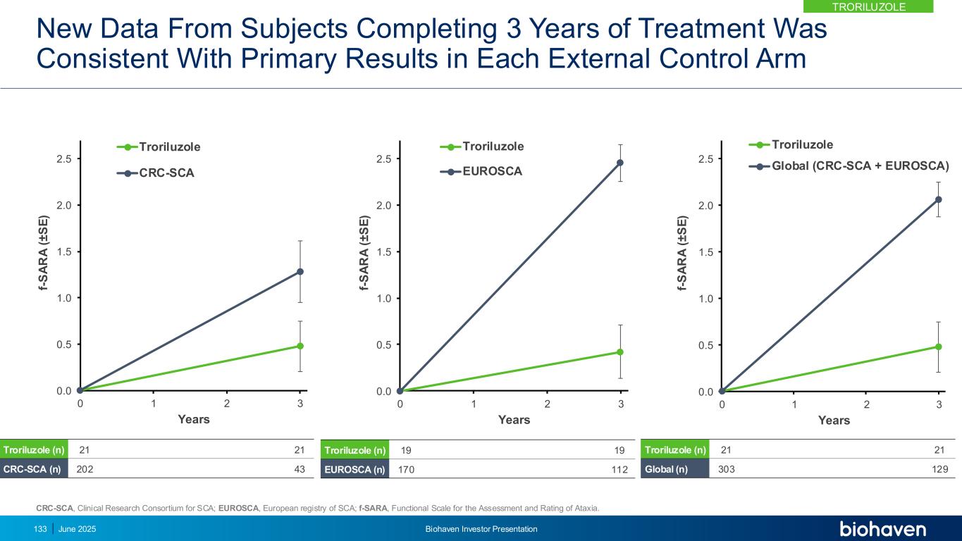 Anchoring Analysis Confirms Need for 3 Year Study to Overcome  Heterogeneity in SCA Progression Patterns • External control was anchored to Study 206  placebo progression rate over 1-year using PSM • Anchored analysis shows efficacy at Years  2 and 3 consistent with primary results from  Study 206-RWE • Addresses any potential bias introduced by  differences in progression rates between RWE  and Study 206 patients • Supports reliability and interpretability of using  external control arm in assessing troriluzole 0.0 0.5 1.0 1.5 2.0 2.5 0 1 2 3 f- S A R A  ( ± S E ) Years ** * Troriluzole (n) 101 90 75 61 Global (n) 273 273 162 129 *  p=0.0019 ** p=0.0014 Global  (CRC-SCA & EUROSCA) Troriluzole CRC-SCA, Clinical Research Consortium for SCA; EUROSCA, European registry of SCA; f-SARA, Functional Scale for the Assessment and Rating of Ataxia; PSM, Propensity Score Matching. Anchoring analysis shows RWE findings are independent and highly consistent with  1-year RCT (Study 206) and closely reflects potential results of a 3 Year RCT study KEY  POINT 132 June 2025 Biohaven Investor Presentation TRORILUZOLE