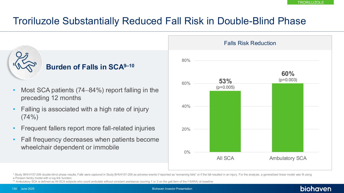 Burden of Falls in SCA9–10 • Most SCA patients (74–84%) report falling in the  preceding 12 months • Falling is associated with a high rate of injury  (74%) • Frequent fallers report more fall-related injuries • Fall frequency decreases when patients become  wheelchair dependent or immobile Falls Risk Reduction Troriluzole Substantially Reduced Fall Risk in Double-Blind Phase * Study BHV4157-206 double-blind phase results; Falls were captured in Study BHV4157-206 as adverse events if reported as “worsening falls” or if the fall resulted in an injury. For the analysis, a generalized linear model was fit using  a Poisson family model with a log link function. ** Ambulatory SCA is defined as All SCA subjects who could ambulate without constant assistance (scoring 1 or 2 on the gait item of the f-SARA) at baseline  53% (p=0.005) 60% (p=0.003) 0% 20% 40% 60% 80% All SCA Ambulatory SCA TRORILUZOLE June 2025 Biohaven Investor Presentation134