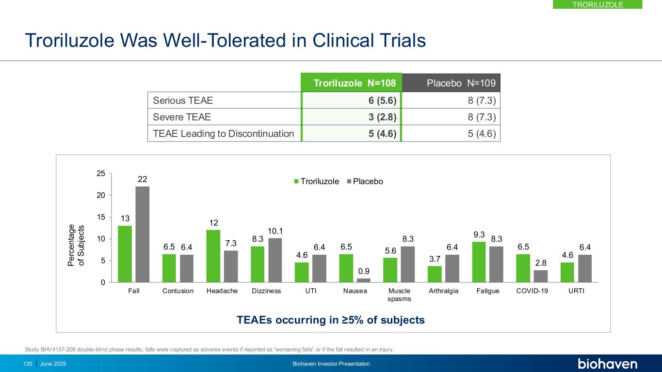 Troriluzole Was Well-Tolerated in Clinical Trials 13 6.5 12 8.3 4.6 6.5 5.6 3.7 9.3 6.5 4.6 22 6.4 7.3 10.1 6.4 0.9 8.3 6.4 8.3 2.8 6.4 0 5 10 15 20 25 Fall Contusion Headache Dizziness UTI Nausea Muscle spasms Arthralgia Fatigue COVID-19 URTI Troriluzole Placebo Troriluzole  N=108 Placebo  N=109 Serious TEAE 6 (5.6) 8 (7.3) Severe TEAE 3 (2.8) 8 (7.3) TEAE Leading to Discontinuation 5 (4.6) 5 (4.6) P e rc e n ta g e   o f  S u b je c ts TEAEs occurring in ≥5% of subjects Study BHV4157-206 double-blind phase results; falls were captured as adverse events if reported as “worsening falls” or if the fall resulted in an injury. TRORILUZOLE June 2025 Biohaven Investor Presentation135
