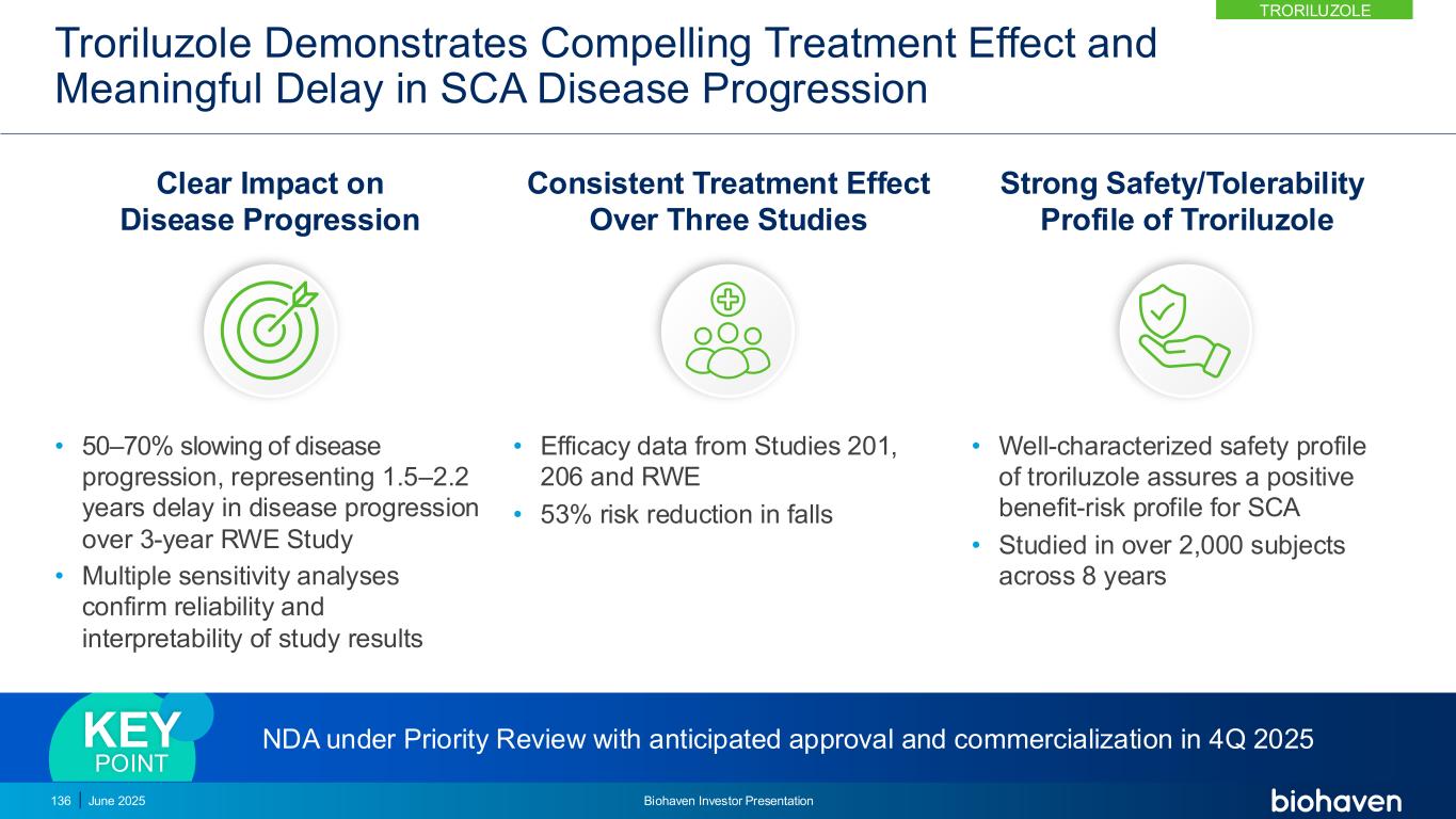 Troriluzole Demonstrates Compelling Treatment Effect and  Meaningful Delay in SCA Disease Progression • Efficacy data from Studies 201,  206 and RWE • 53% risk reduction in falls  • 50–70% slowing of disease  progression, representing 1.5–2.2  years delay in disease progression  over 3-year RWE Study • Multiple sensitivity analyses  confirm reliability and  interpretability of study results Consistent Treatment Effect  Over Three Studies Clear Impact on  Disease Progression • Well-characterized safety profile  of troriluzole assures a positive  benefit-risk profile for SCA • Studied in over 2,000 subjects  across 8 years Strong Safety/Tolerability Profile of Troriluzole NDA under Priority Review with anticipated approval and commercialization in 4Q 2025KEY  POINT 136 June 2025 Biohaven Investor Presentation TRORILUZOLE