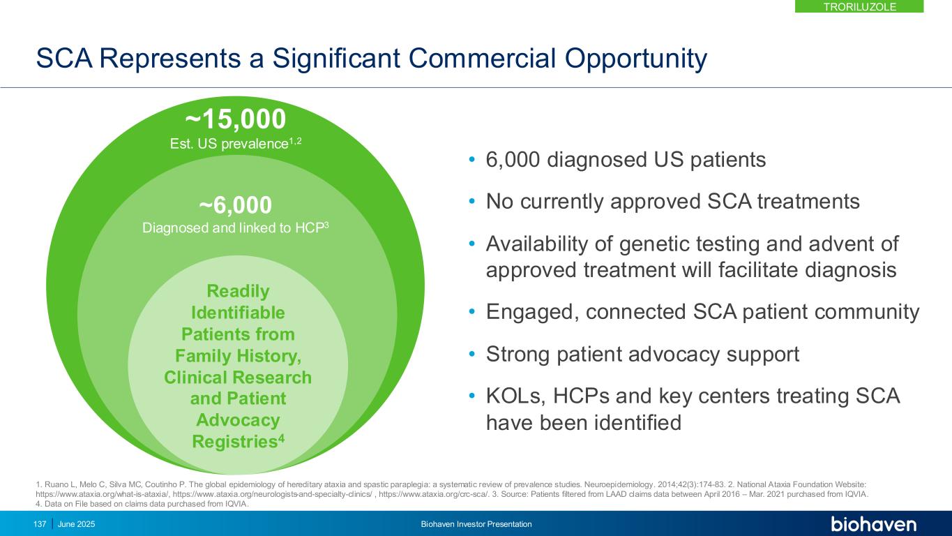 SCA Represents a Significant Commercial Opportunity • 6,000 diagnosed US patients  • No currently approved SCA treatments • Availability of genetic testing and advent of  approved treatment will facilitate diagnosis • Engaged, connected SCA patient community • Strong patient advocacy support • KOLs, HCPs and key centers treating SCA  have been identified Readily Identifiable  Patients from  Family History,  Clinical Research  and Patient  Advocacy  Registries4 ~6,000 Diagnosed and linked to HCP3 ~15,000 Est. US prevalence1,2 1. Ruano L, Melo C, Silva MC, Coutinho P. The global epidemiology of hereditary ataxia and spastic paraplegia: a systematic review of prevalence studies. Neuroepidemiology. 2014;42(3):174-83. 2. National Ataxia Foundation Website:  https://www.ataxia.org/what-is-ataxia/, https://www.ataxia.org/neurologists-and-specialty-clinics/ , https://www.ataxia.org/crc-sca/. 3. Source: Patients filtered from LAAD claims data between April 2016 – Mar. 2021 purchased from IQVIA.  4. Data on File based on claims data purchased from IQVIA.  TRORILUZOLE June 2025 Biohaven Investor Presentation137