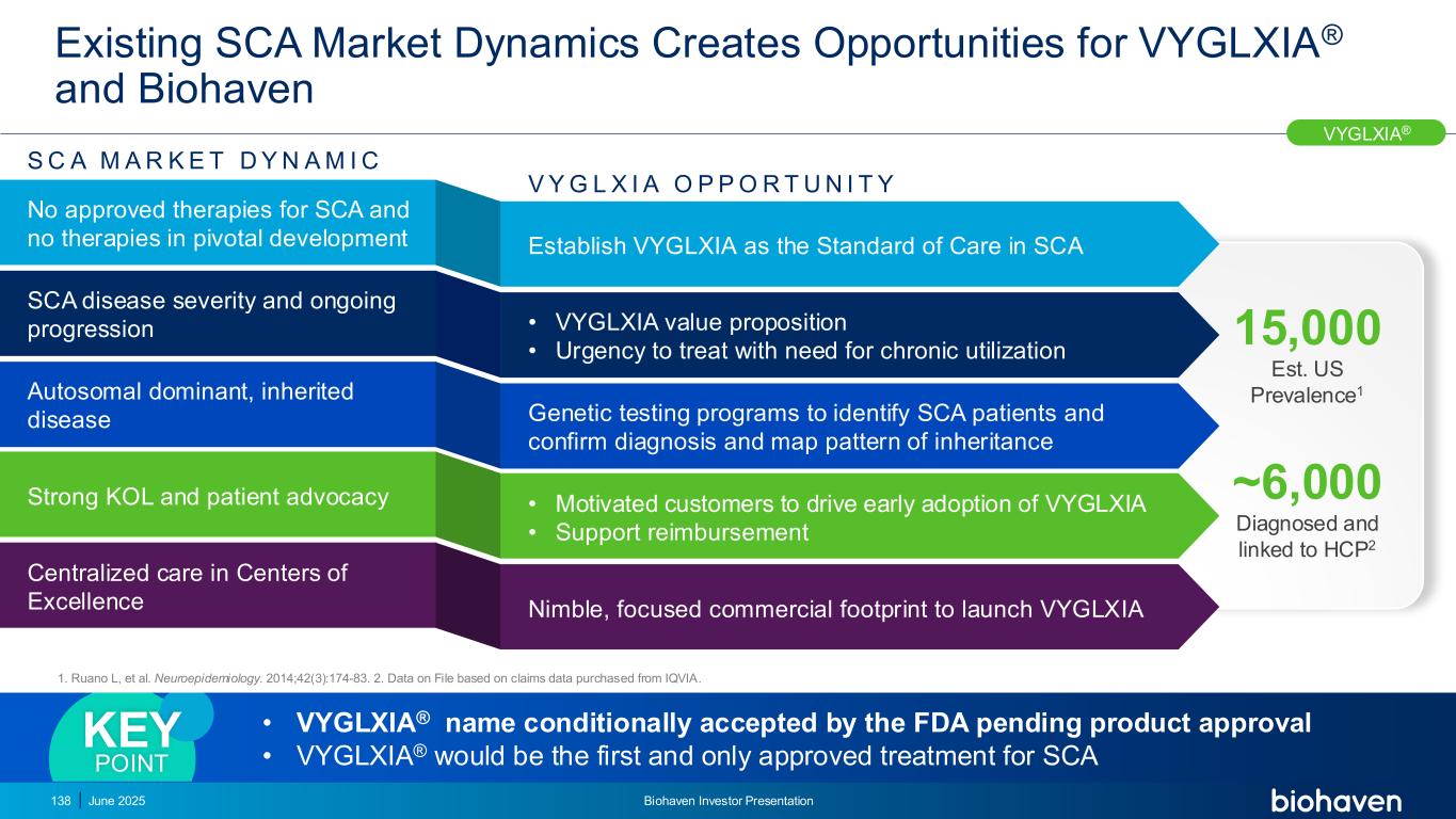 Existing SCA Market Dynamics Creates Opportunities for VYGLXIA®  and Biohaven • VYGLXIA® name conditionally accepted by the FDA pending product approval • VYGLXIA® would be the first and only approved treatment for SCA KEY  POINT No approved therapies for SCA and  no therapies in pivotal development SCA disease severity and ongoing  progression Autosomal dominant, inherited  disease Strong KOL and patient advocacy Centralized care in Centers of  Excellence Establish VYGLXIA as the Standard of Care in SCA • VYGLXIA value proposition • Urgency to treat with need for chronic utilization Genetic testing programs to identify SCA patients and  confirm diagnosis and map pattern of inheritance • Motivated customers to drive early adoption of VYGLXIA • Support reimbursement Nimble, focused commercial footprint to launch VYGLXIA S C A M A R K E T  D Y N A M I C V Y G L X I A  O P P O R T U N I T Y VYGLXIA® ~6,000 Diagnosed and  linked to HCP2 15,000 Est. US  Prevalence1 1. Ruano L, et al. Neuroepidemiology. 2014;42(3):174-83. 2. Data on File based on claims data purchased from IQVIA.  138 June 2025 Biohaven Investor Presentation