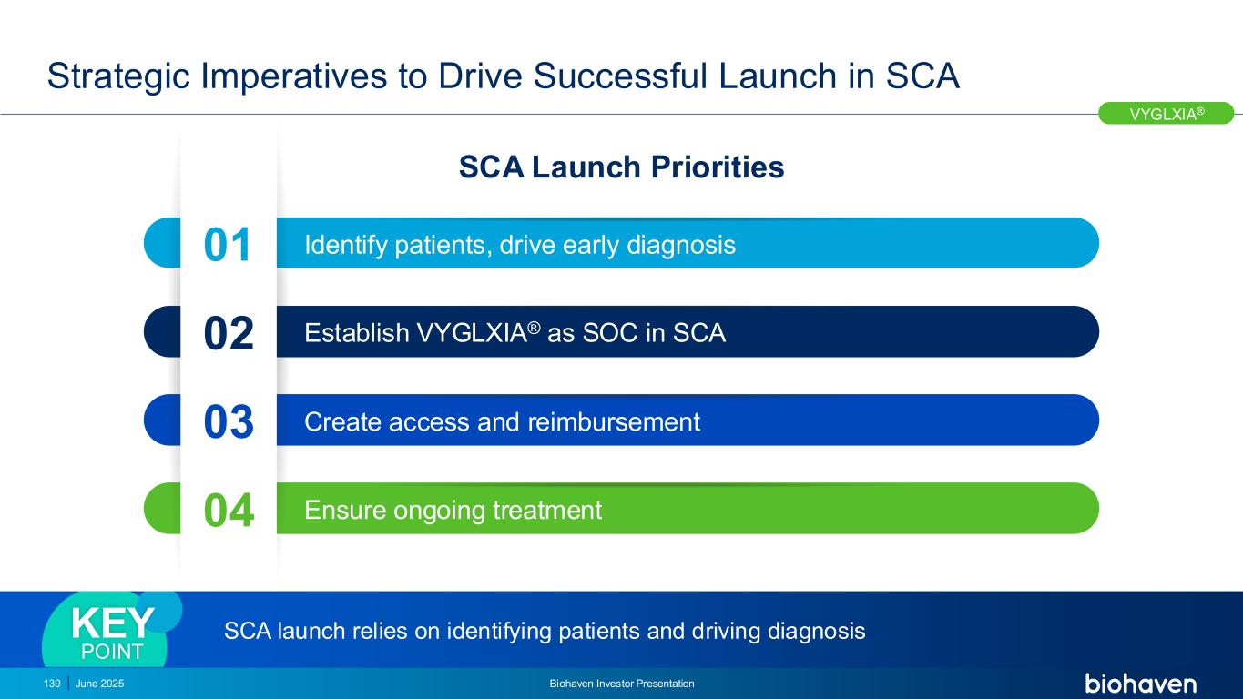 Strategic Imperatives to Drive Successful Launch in SCA Identify patients, drive early diagnosis  Establish VYGLXIA® as SOC in SCA Create access and reimbursement Ensure ongoing treatment 01 02 03 04 SCA Launch Priorities SCA launch relies on identifying patients and driving diagnosisKEY  POINT VYGLXIA® 139 June 2025 Biohaven Investor Presentation