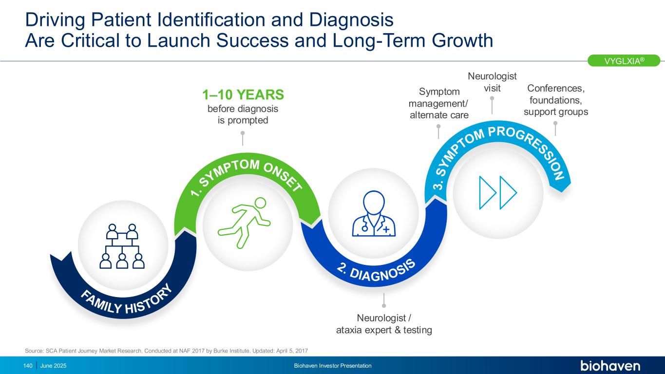 Driving Patient Identification and Diagnosis  Are Critical to Launch Success and Long-Term Growth FAMILY HISTOR Y 2. DIAGNOSIS 3 . S Y M PTOM PROGRESS IO N 1. SYMPTOM ONSET 1–10 YEARS  before diagnosis  is prompted Neurologist / ataxia expert & testing Symptom management/  alternate care Neurologist visit Conferences,  foundations,  support groups Source: SCA Patient Journey Market Research. Conducted at NAF 2017 by Burke Institute. Updated: April 5, 2017 VYGLXIA® 140 June 2025 Biohaven Investor Presentation