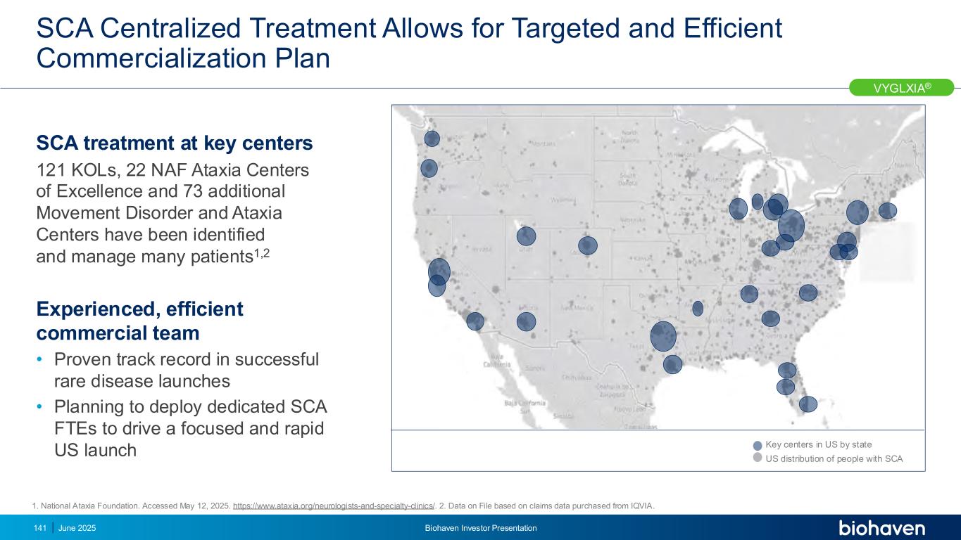 SCA Centralized Treatment Allows for Targeted and Efficient  Commercialization Plan June 2025 Biohaven Investor Presentation141 Key centers in US by state US distribution of people with SCA 1. National Ataxia Foundation. Accessed May 12, 2025. https://www.ataxia.org/neurologists-and-specialty-clinics/. 2. Data on File based on claims data purchased from IQVIA.  VYGLXIA® SCA treatment at key centers 121 KOLs, 22 NAF Ataxia Centers  of Excellence and 73 additional  Movement Disorder and Ataxia  Centers have been identified  and manage many patients1,2 Experienced, efficient  commercial team • Proven track record in successful  rare disease launches • Planning to deploy dedicated SCA  FTEs to drive a focused and rapid  US launch
