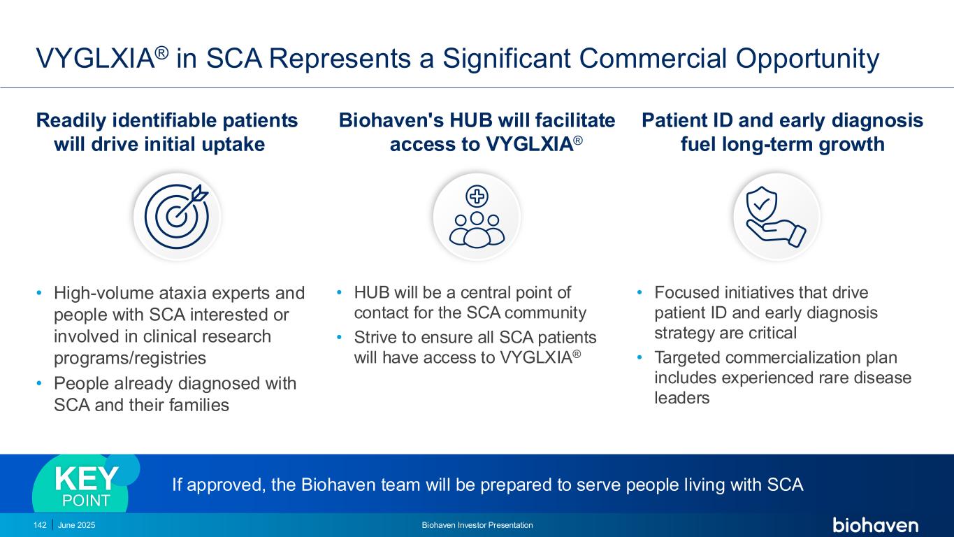 VYGLXIA® in SCA Represents a Significant Commercial Opportunity • HUB will be a central point of  contact for the SCA community • Strive to ensure all SCA patients  will have access to VYGLXIA® • High-volume ataxia experts and  people with SCA interested or  involved in clinical research  programs/registries • People already diagnosed with  SCA and their families Biohaven's HUB will facilitate  access to VYGLXIA® Readily identifiable patients  will drive initial uptake • Focused initiatives that drive  patient ID and early diagnosis  strategy are critical • Targeted commercialization plan  includes experienced rare disease  leaders Patient ID and early diagnosis  fuel long-term growth If approved, the Biohaven team will be prepared to serve people living with SCAKEY  POINT 142 June 2025 Biohaven Investor Presentation