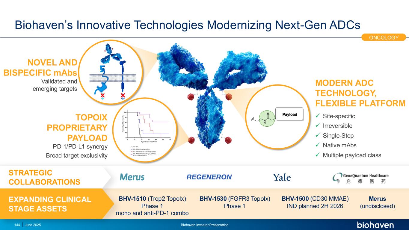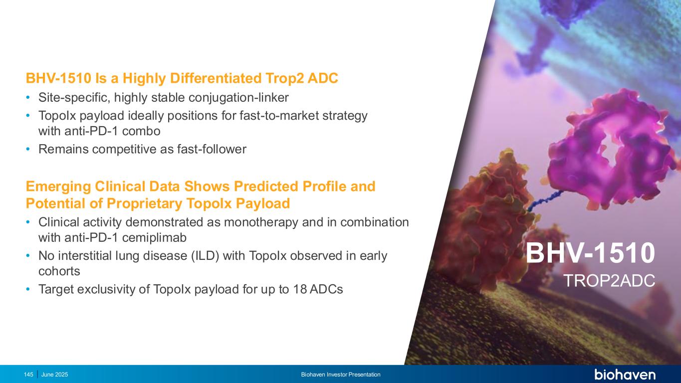 Merus (undisclosed) STRATEGIC  COLLABORATIONS Biohaven’s Innovative Technologies Modernizing Next-Gen ADCs  June 2025 Biohaven Investor Presentation144 BHV-1510 (Trop2 TopoIx) Phase 1 mono and anti-PD-1 combo BHV-1500 (CD30 MMAE)  IND planned 2H 2026 BHV-1530 (FGFR3 TopoIx)  Phase 1 EXPANDING CLINICAL  STAGE ASSETS  MODERN ADC  TECHNOLOGY,  FLEXIBLE PLATFORM ✓ Site-specific ✓ Irreversible ✓ Single-Step ✓ Native mAbs ✓ Multiple payload class NOVEL AND  BISPECIFIC mAbs Validated and  emerging targets TOPOIX PROPRIETARY PAYLOAD PD-1/PD-L1 synergy Broad target exclusivity ONCOLOGY