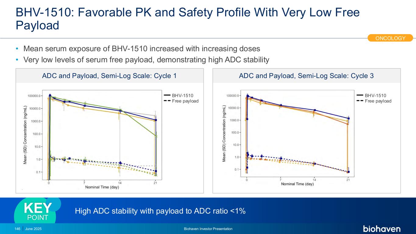 BHV-1510: Favorable PK and Safety Profile With Very Low Free  Payload • Mean serum exposure of BHV-1510 increased with increasing doses • Very low levels of serum free payload, demonstrating high ADC stability June 2025 Biohaven Investor Presentation146 Prelim data from ongoing study ADC and Payload, Semi-Log Scale: Cycle 1 ADC and Payload, Semi-Log Scale: Cycle 3 ONCOLOGY BHV-1510 Free payload BHV-1510 Free payload High ADC stability with payload to ADC ratio <1%KEY  POINT